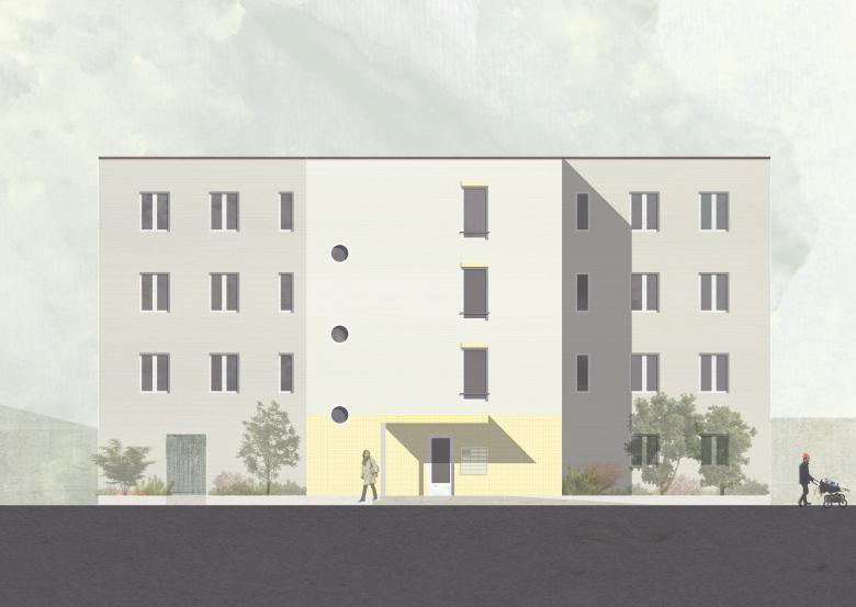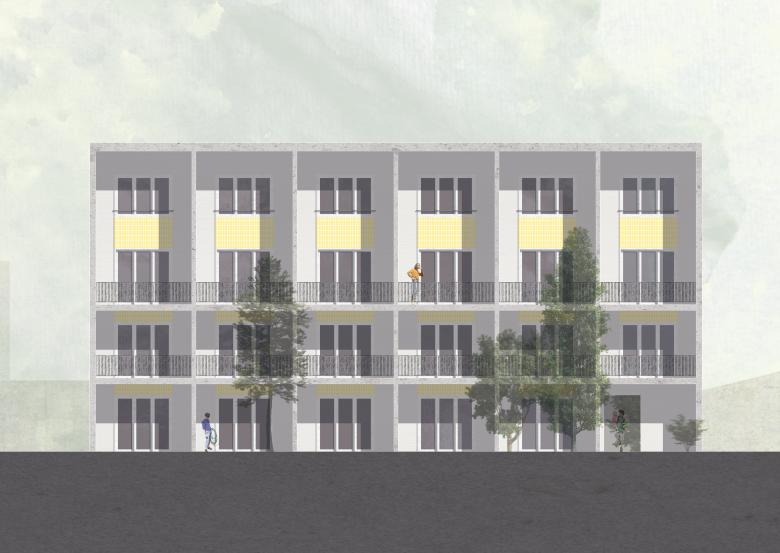 Trotz des geringen Budgets galt es eine hohe räumliche Qualität und anspruchsvolle äußere Gestaltung zu schaffen. Schon im Vorentwurfsprozess wurde auf eine Schottenbauweise mit kurzen Spannweiten zur möglichst effizienten und kostengünstigen Realisierung gesetzt. Die klare Struktur lässt sich durch die der Hoffassade vorgelagerten Loggien ablesen, welche gleichzeitig als konstruktiver Sonnenschutz dienen.