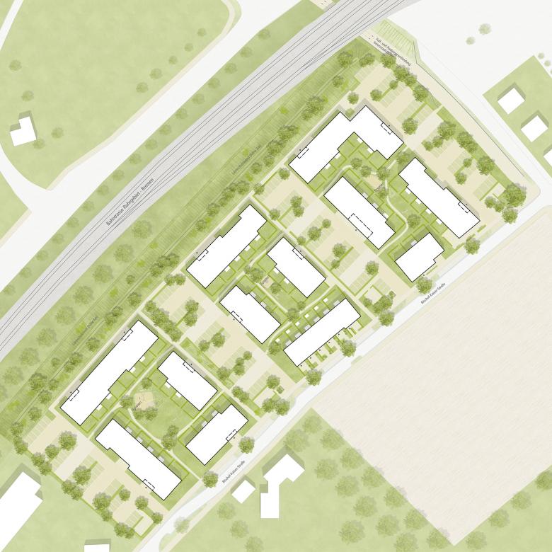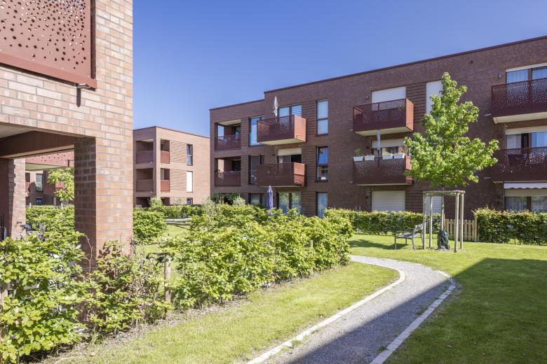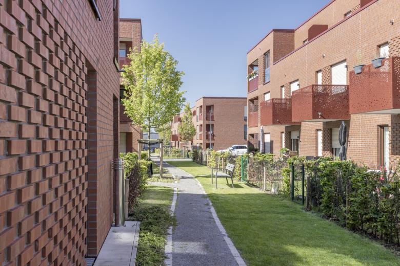 Das Wohnquartier "Am Haselbach" in Dülmen steht für die Revitalisierung einer Brache in ein maßvoll verdichtetes Wohnquartier mit eigener Identität. In nur 1 km Entfernung zum Stadtkern entstanden auf einem aufgelassenen Areal eines Großmühlenbetriebes drei Wohnhöfe mit einem Wohnungsmix für Menschen aller Altersklassen mit ihren unterschiedlichen Wohnbedürfnissen. Von der Singlewohnung bis zu individuell erschlossenen Maisonettewohnungen für Familien als Alternative zum Einfamilienhaus reicht das Spektrum der Wohnungstypen und -größen. 111 öffentlich geförderte und 76 frei finanzierte Wohnungen, davon 16 rollstuhlgerecht, verteilen sich auf 12 Häuser und unterstützen so soziale Mischung und die Bildung von lebendigen Nachbarschaften. Begrünte Innenhöfe mit Gemeinschafts- und Spielflächen charakterisieren die Quartiersmitten, laden zum Treffen und Verweilen ein und leisten einen wertvollen Beitrag für ein kommunikatives, aktives Miteinander.