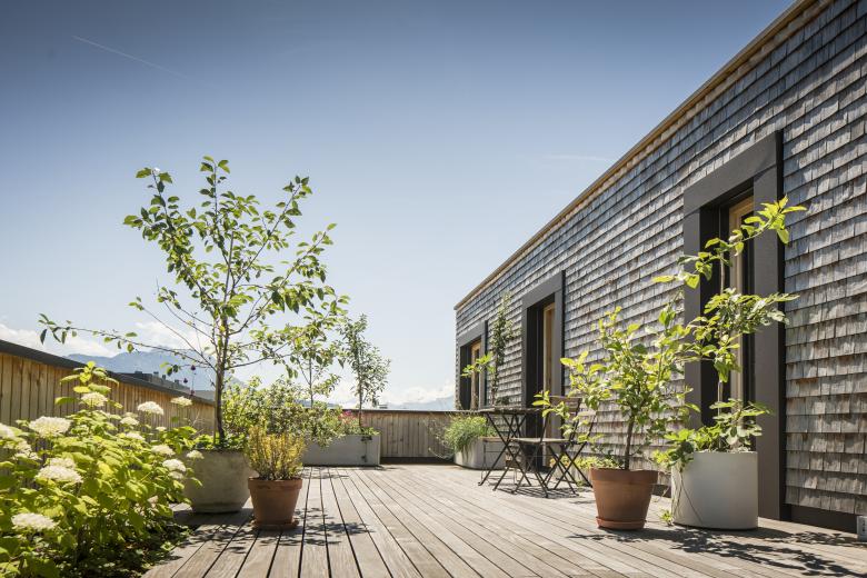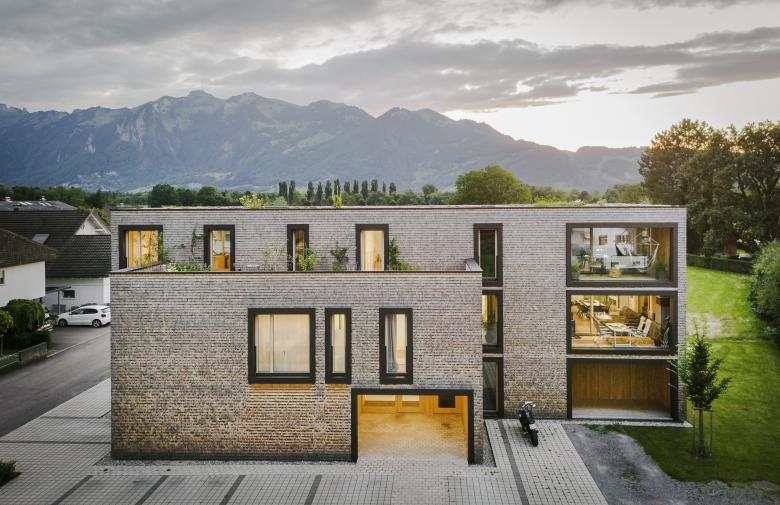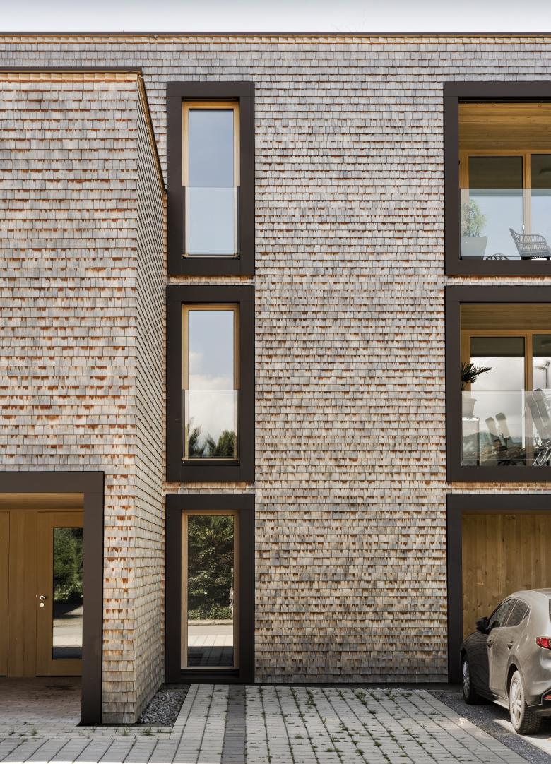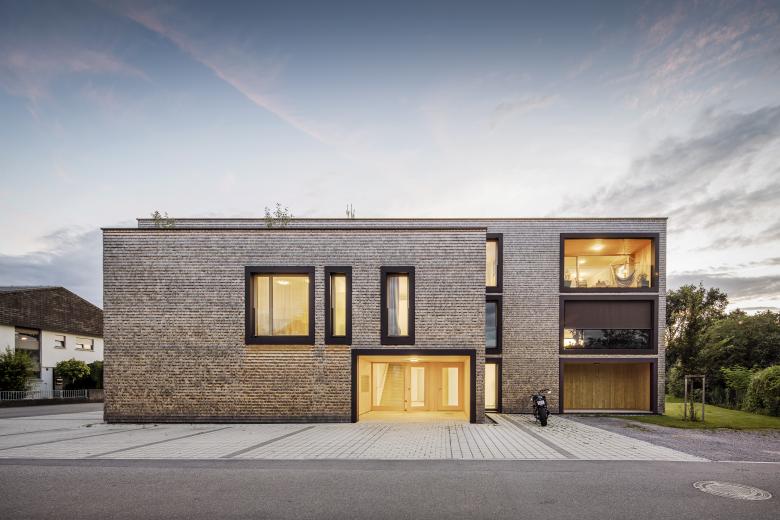 Kompakt strukturiert fächern sich die 8 Wohnungen windmühlenartig um den Erschließungskern auf. Alle Wohnungen sind dreiseitig belichtet und flexibel möblierbar. Der differenziert gegliederte Baukörper schafft platzartige Außenräume im Bereich der Terrassen und fügt sich maßstäblich in die umgebende Siedlungsstruktur ein.