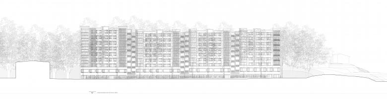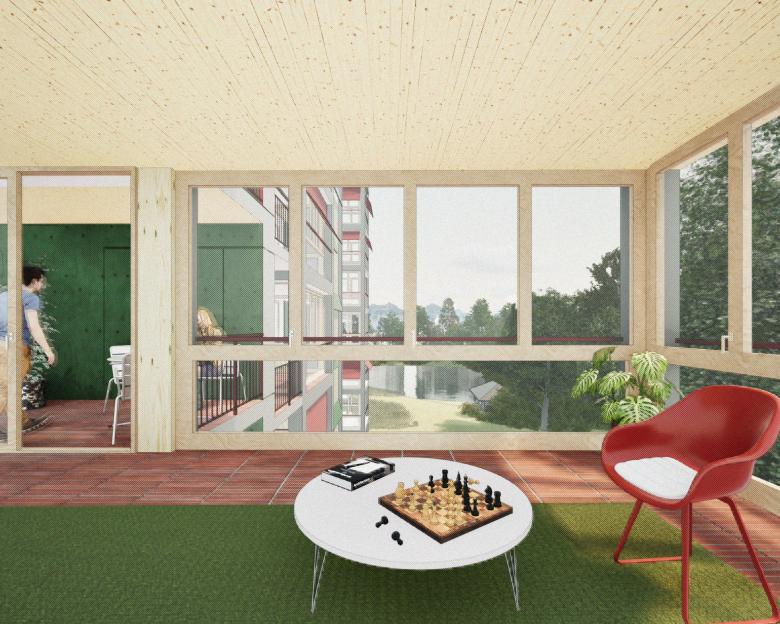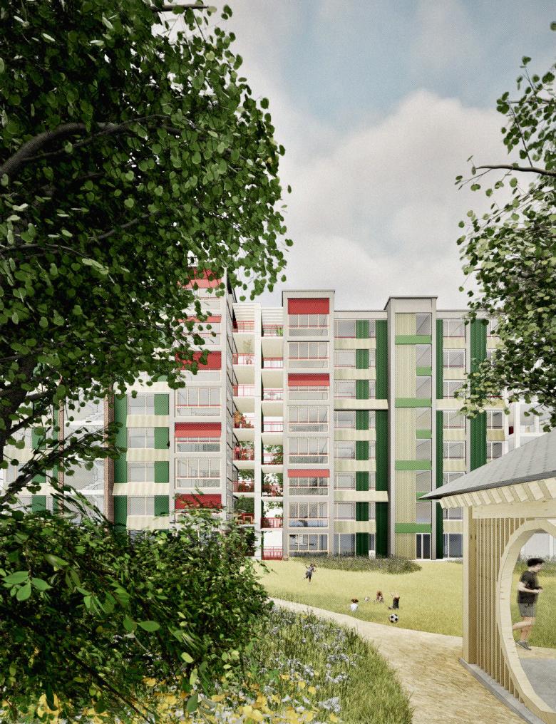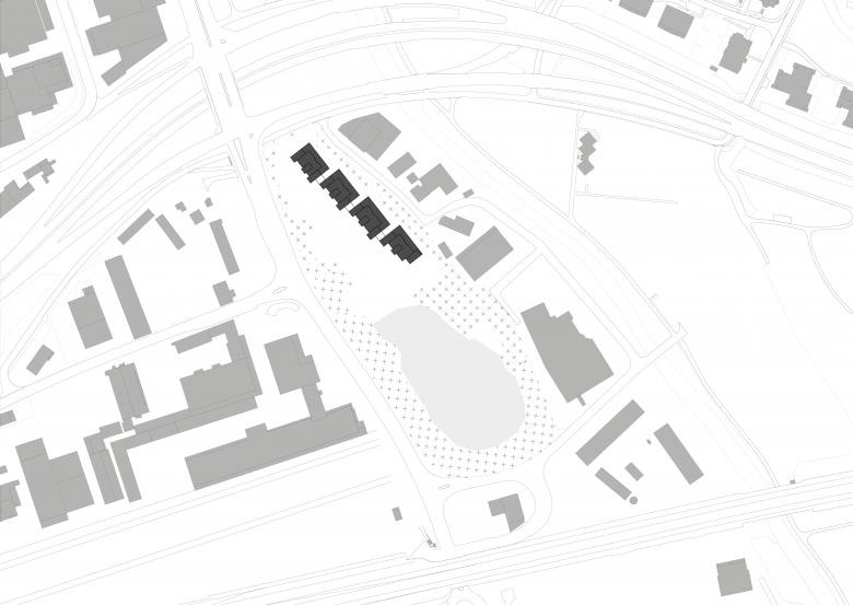 Als Studienauftrag entsteht eine geplante Wohnüberbauung in einer ehemaligen Kiesgrube und bildet trotz stark frequentierten Verkehrswegen eine grüne Oase mit Weiher und Baumkranz. Der gestaffelte Baukörper folgt der Topografie und verbindet Zugang und Parkebene über eine Freitreppe. Offen gegliedert mit Loggien wirkt die Anlage als Ensemble von vier Gebäuden. Vorgartenflächen mit Spiel- und Aufenthaltsbereichen fördern die soziale Qualität im Quartier. Der rückwärtige Park mit Pavillon und Rundweg wird zum gemeinschaftlichen Zentrum. Loftwohnungen im Parkgeschoss sowie flexible Schaltzimmer ermöglichen eine grosse Wohnvielfalt. Die durchgesteckten Wohnungen profitieren von Sonne auf beiden Seiten, ruhiger Lage und Blick ins Grüne. Durch vertikale und horizontale Gliederung sowie unterschiedliche Materialien erhält das Gebäude eine klare Tektonik und angenehme Massstäblichkeit. Holzbauweise, Lehmspeicherwände und Lärmschutzmassnahmen sichern ein gesundes Raumklima und hohe Aufenthaltsqualität.