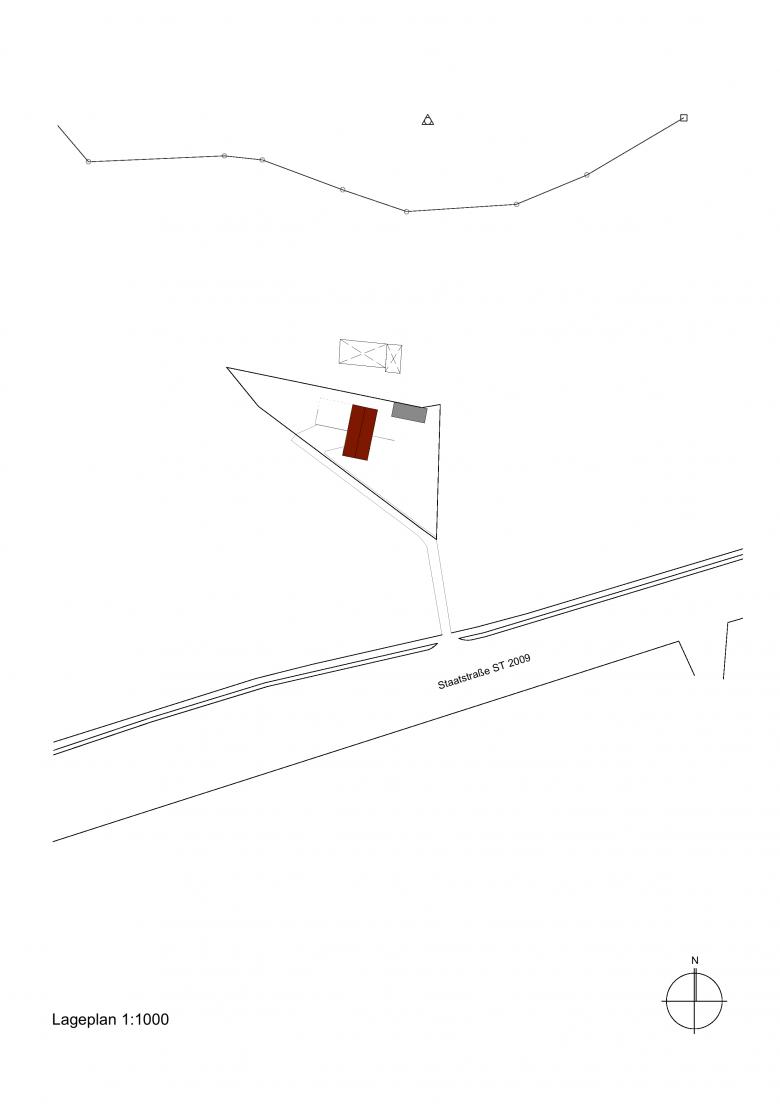 Um den Lärmemissionen, die durch die Lage der Kreisstraße gegeben sind, entgegen zu wirken, erlaubt die Positionierung der Geschosstreppen quer zur Firstrichtung die Teilung des Gebäudes in eine laute Seite (Koch, Ess- und Wohnbereich) und eine leise Seite (Schlafbereiche).
