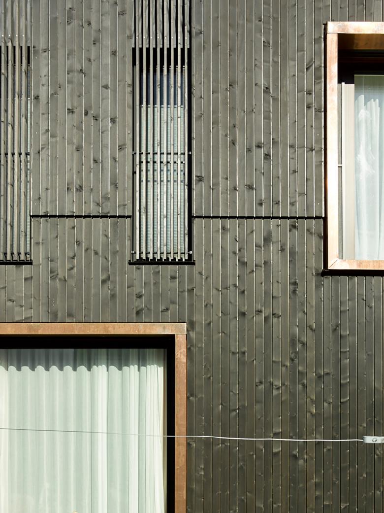 Die als Holzelementbau gefertigte Fassade wurde mit regionalen Handwerkern erarbeitet. Die mit dunklen Pigmenten bemalten Holzlatten kleiden den Baukörper in eine sattschwarze Hülle. Die gebeizten Dreischichtplatten überführen das optische und haptische Konzept partiell ins Innere.