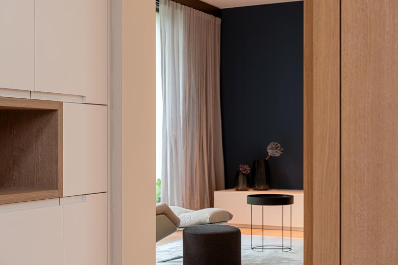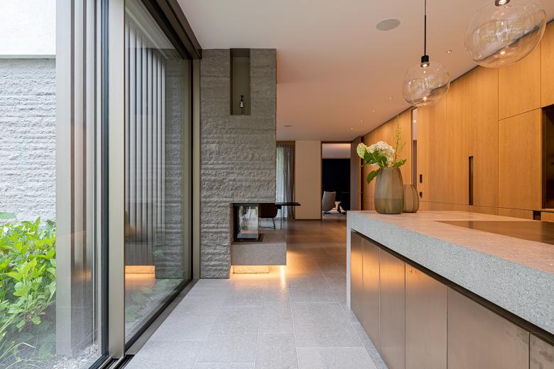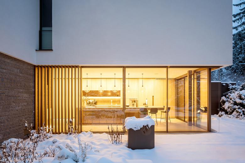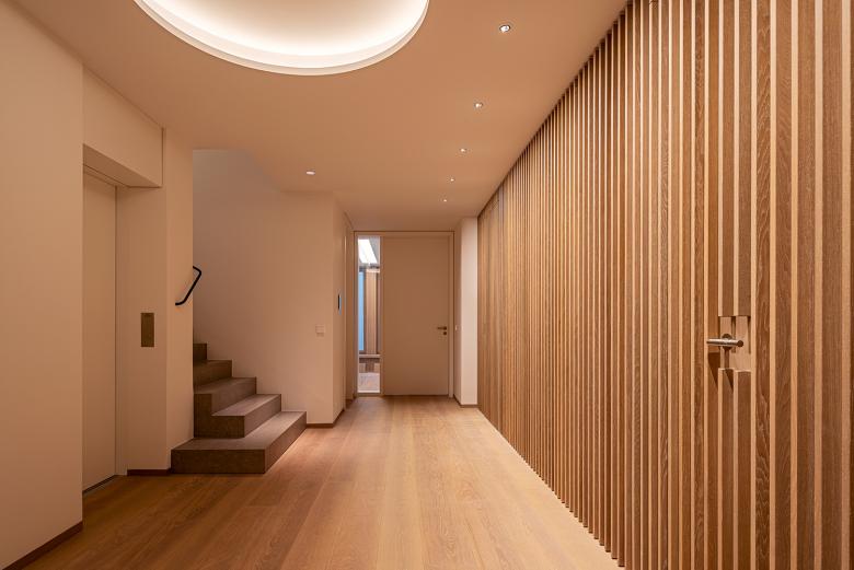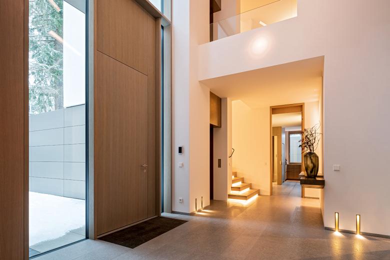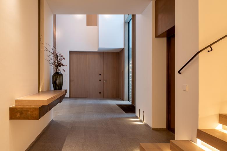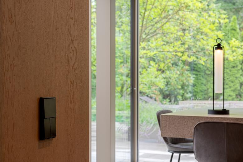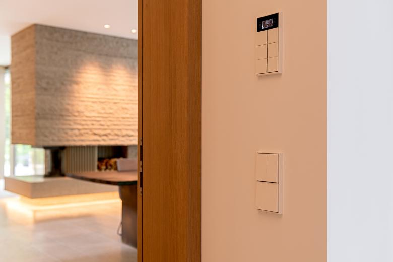 Die Innenausstattung der Villa ist hochwertig. Durch eine reduzierte Materialwahl und ein sensibles Lichtkonzept wurde eine minimalistische und zugleich sinnliche Atmosphäre geschaffen. Sowohl im Innenraum als auch in der Fassadengestaltung treffen weiße Wandflächen auf Naturstein und Holz. Einbauschränke schaffen im Inneren viel Stauraum und sorgen für eine reduzierte, aufgeräumte Atmosphäre. Eingefräste Griffleisten an Türen und Schränken sind Ausdruck dieses absoluten Minimalismus. Die schlichten Schalter, Taster und Steckdosen der LS Serie von JUNG fügen sich perfekt in dieses Ambiente ein. Die Flächenschalter LS 990 sowie die KNX Taster F 40 in den Farben Messing Antik und Alpinweiß passen perfekt zum puristischen, aber hochwertigen Design. Mit den F 40 Raumcontrollern lassen sich Temperatur, Licht und Beschattung komfortabel steuern.
