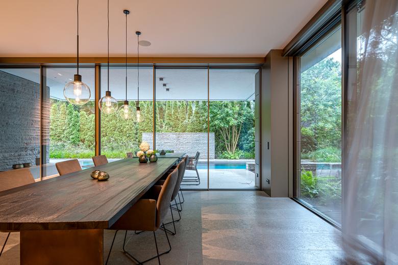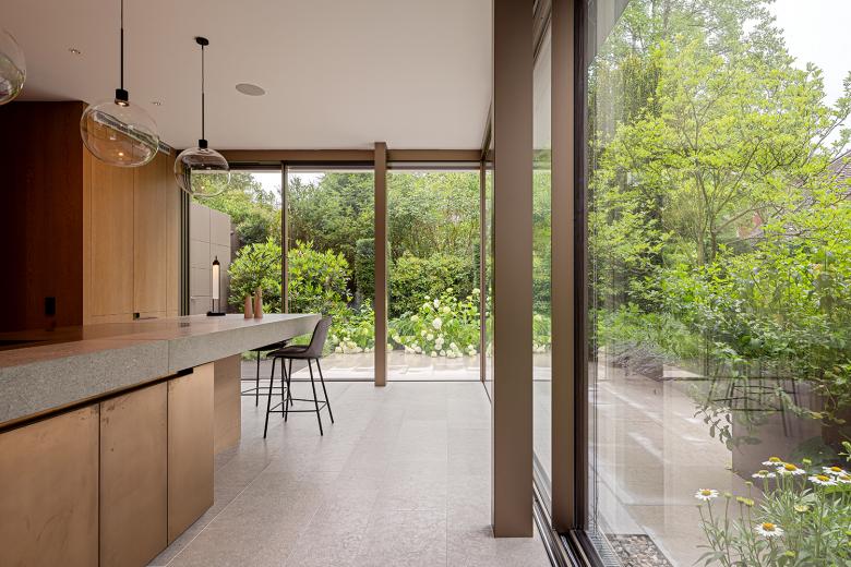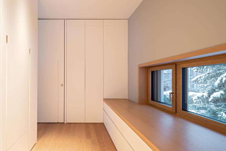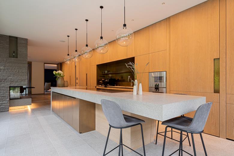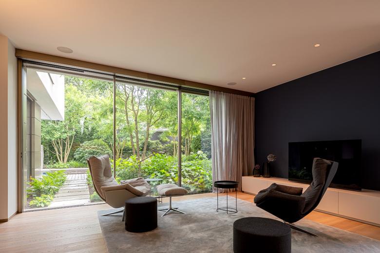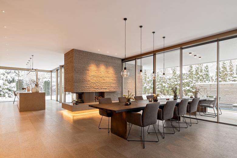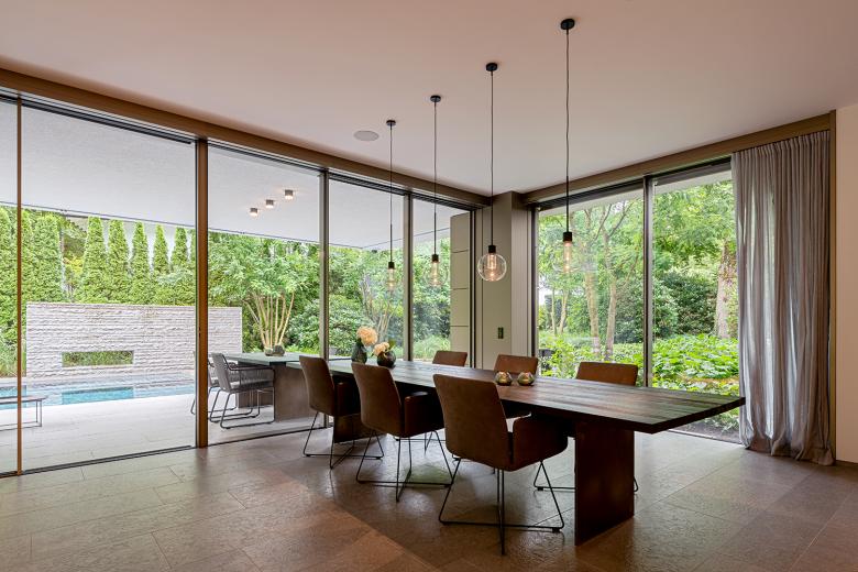 Der Grundriss des Erdgeschosses scheint durch raumhohe Schiebefenster fließend in den Außenraum überzugehen. Der Pool wird so zu einem Teil des offenen Wohnbereichs. Ein zweigeschossiger, fast sakral anmutender Eingangsbereich schafft zudem eine Schnittstelle zum Obergeschoss. Hier befinden sich der Elternschlafbereich mit eigenem Bad und separater Ankleide sowie zwei Kinderzimmer. Im Dachgeschoss befinden sich zwei Arbeitszimmer für die Eltern sowie die Dachterrasse mit Whirlpool.