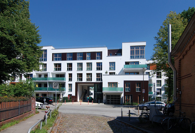 Nach gewonnenem Wettbewerb und intensiver Abstimmung mit den Fachbehörden ist eine attraktive innerstädtische Wohnanlage, die 59 Wohneinheiten mit nachbarschaftsbezogenen Wohnhöfen von differenzierter räumlicher Qualität über einer Tiefgarage beherbergt, entstanden. Der Wohnungsmix der barrierefrei gestalteten Anlage ist vielfältig und ideal aufgestellt für ein Mehrgenerationenwohnen. Der geschlossene Blockrand, der den Maßstab der von Bauten der Gründerzeit geprägten Straßenzüge aufnimmt, lässt nicht nur die rückwärtige Bebauung und die Wohnhöfe, sondern auch den Gebäudebestand in der Tiefe des Quartiers von dem so erreichten verbesserten Schallschutz profi tieren. Weiße Putzfassaden kontrastieren mit warmen Holztönen der vorgehängten Fassaden und gefärbtem Glas.