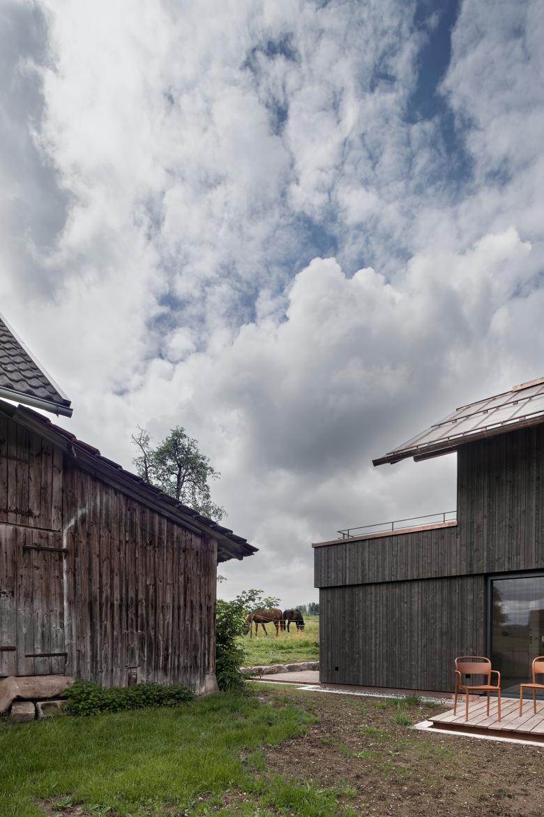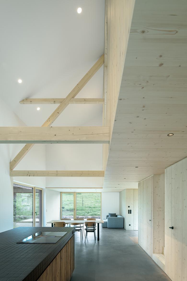 Das 2-geschossige Satteldachgebäude mit sichtbarem Dachtragwerk wurde auf zwei Geschosse unterteilt. Im EG befinden sich Wohnen, Essen, Kochen, ein Gästezimmer und Technikraum. Der Luftraum im OG fungiert als offener Flur, der Bad und Schlafzimmer verbindet. Die Fensteröffnungen sind in Größe und Positionierung an die alten Scheunentore angelehnt, und öffnen das Gebäude in jede Himmelsrichtung. Durch verschiebbare Holztore davor kann es teilweise oder gänzlich geschlossenen werden, sodass die neue „Wohnscheune“ kaum von den umliegenden Schuppen unterschieden werden kann.