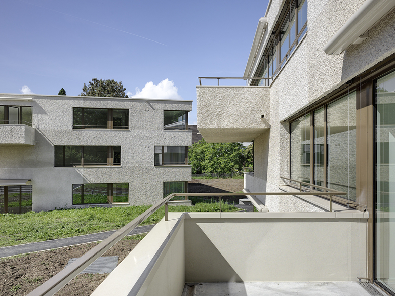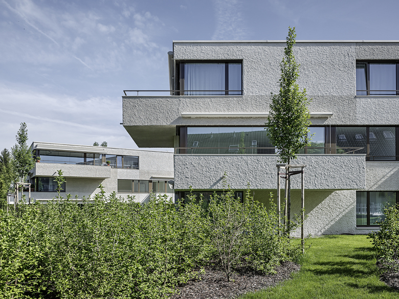 Die Auseinandersetzung mit der „Massstäblichkeit“ wird nicht nur durch die städtebaulichen Disposition der Siedlung zum Ausdruck gebracht, sondern spiegelt sich auch in der architektonischen Erscheinung und in der Fassadengestaltung der fünf Häuser wider. Die über die Gebäudefluchten auskragenden, geschossweise versetzten Balkone brechen die kompakten Gebäudevolumen an den exponierten Ecksituationen auf und lassen die Häuser untereinander und mit ihrer Umgebung interagieren. In einem übergeordneten, subtilen Fassadenraster bestehend aus versetzten Fensteröffnungen, Fenstereinteilungen und farblich nuancierten Putzfeldern im Karomuster werden feingliedrige „Grössenverhältnisse“ auf die Fassade projiziert, welche die Gebäudedimensionen unterteilen, gliedern und bespielen.