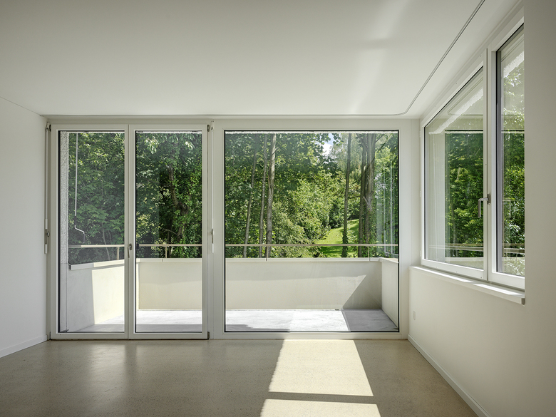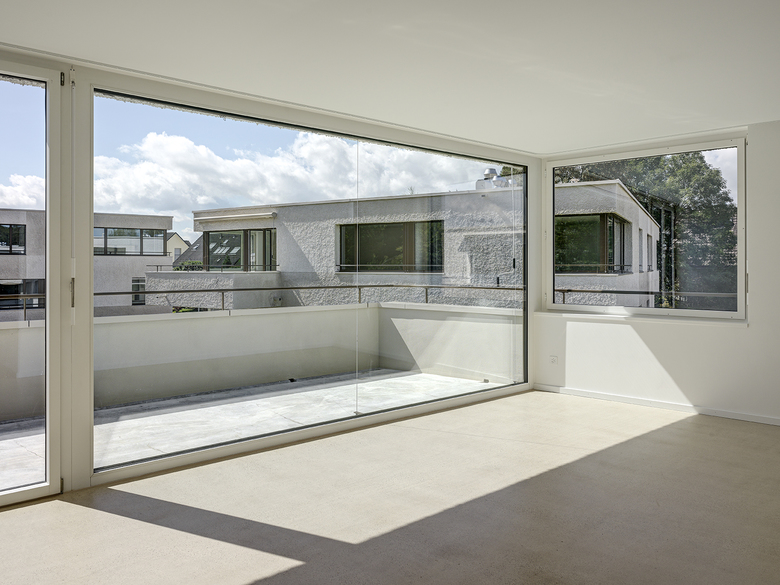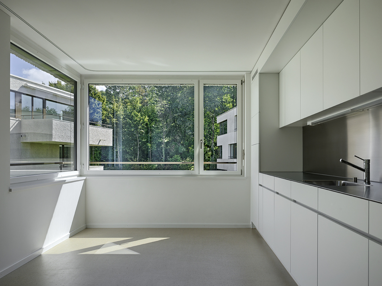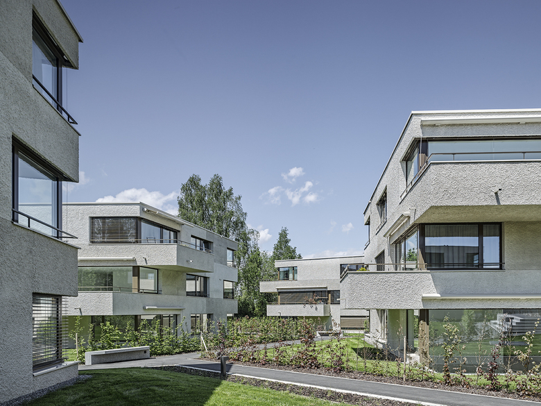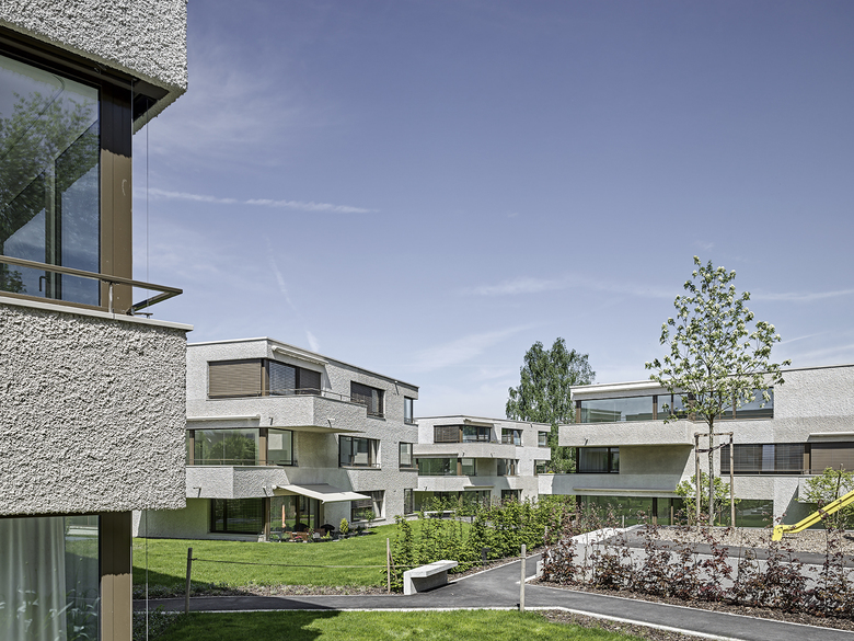 Die zueinander versetzten und leicht ausgedrehten Häuser mit trapezförmigem Zuschnitt gliedern sich selbstverständlich in das Quartier ein. Durch präzise Setzung und Höhenstaffelung sind die dreigeschossigen Gebäudekörper natürlich in die Topografie eingebettet. Das Drehen und Spiegeln der im Grundriss verwandten Häuser verhindert ein streng repetitives und homogenes Erscheinungsbild - die Siedlung erhält ein eigenständiges und unverkennbares Gesicht. Das gewählte geometrische Ordnungsprinzip akzentuiert die Sichtbezüge innerhalb der Siedlung und stärkt die individuelle Ausrichtung der Wohnungen. Es entsteht ein dynamischer und differenziert ausgebildeter Siedlungsraum mit fliessenden Aussenräumen, der die Gesamtanlage mit dem angrenzenden Landschaftsraum verwebt.