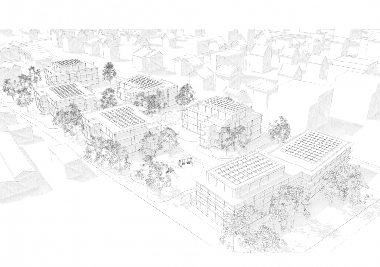 Die ortsbauliche Setzung beruht auf der differenzierten Anordnung von Punktbauten, ähnlich der südlich angrenzenden Nachbarbebauung. Diese fügen sich in der perspektivischen Wahrnehmung zwischen räumlich dichten und weiten Situationen zu einer einheitlichen feinkörnigen Bebauungsstruktur.