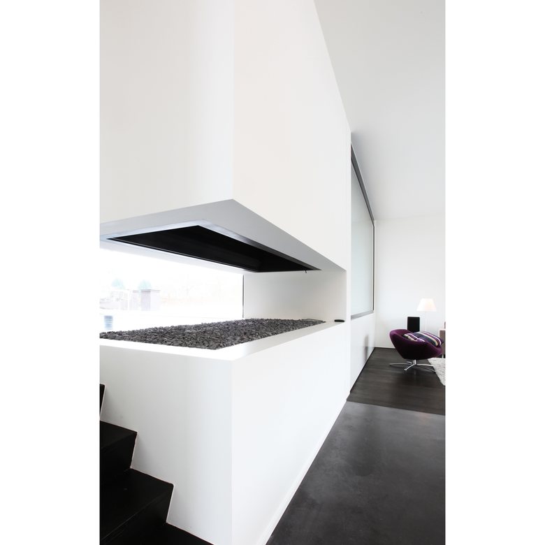Een tweede element dat een grote rol speelt in de architectuurbeleving is de open haard. Doordat er gewerkt is met wisselende vloerpeilen gaat de haard vanuit de keuken anders ervaren worden dan vanuit de eetruimte. Er is ook gekozen om vanuit de leefruimte geen direct zicht te geven op het zwembad en de achterliggende tuin, maar enkel op het aanliggende ochtend- en avondterras. Door het zwembad enkel in de zichtlijn van de keuken te leggen wordt het verrassingseffect in de woning vergroot.