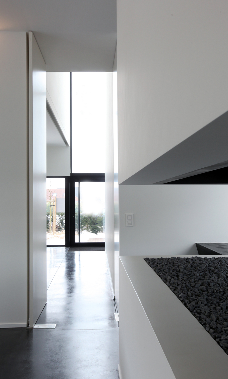 De architectuurbeleving begint reeds bij het betreden van de woning. Dit gebeurt via een brede pivoterende deur die toegang geeft tot een dubbelhoge inkomruimte, grenzend aan de ontvangstruimte. De bovenliggende vide is de architecturale verbinding tussen gelijkvloers en verdieping. De muur in de vide heeft een begeleidende functie naar de rest van de woning, zowel in horizontale als in verticale zin. Er is gekozen om het plafondpeil van het gelijkvloers over de volledige oppervlakte gelijk te houden, in combinatie met wisselende vloerpeilen. Hierdoor vormen de verschillende ruimtes één geheel met variërende hoogtes en verschillende belevingswaarden.