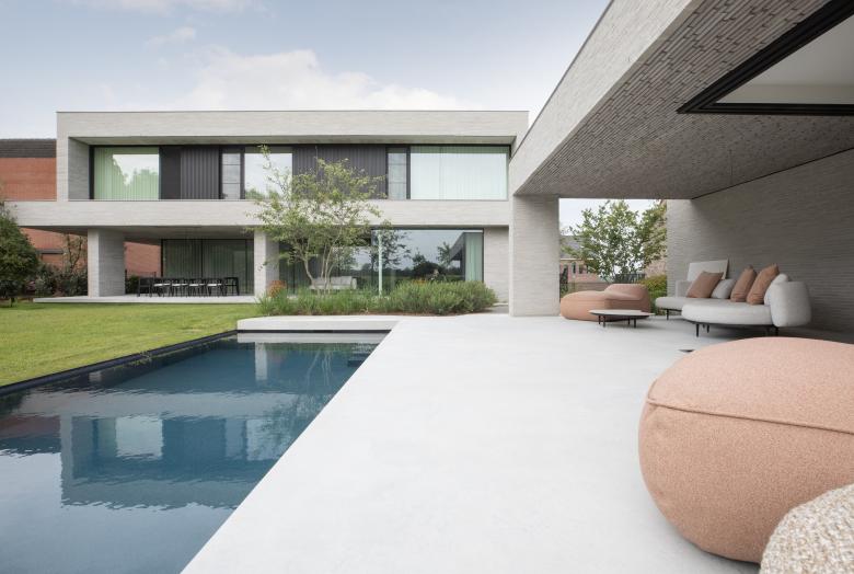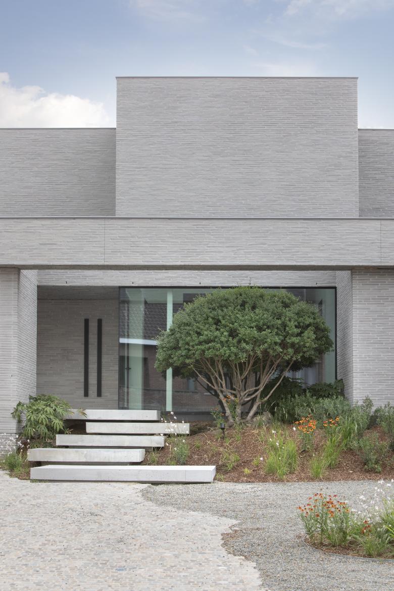 De woning biedt belevingen in een oase van rust, ook al ligt ze langs een drukke steenweg. Een patio, een terugliggende inkomhal zorgen voor een akoestische buffer. Een volume scheidt de zitruimte van de leefkeuken. De zetel is geplaatst zodat in twee richtingen gekeken kan worden: naar de haard of kastenwand met verborgen tv. Grote gevelopeningen bieden maximaal contact met de tuin.