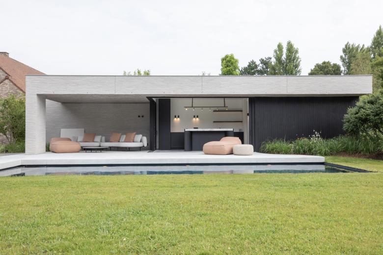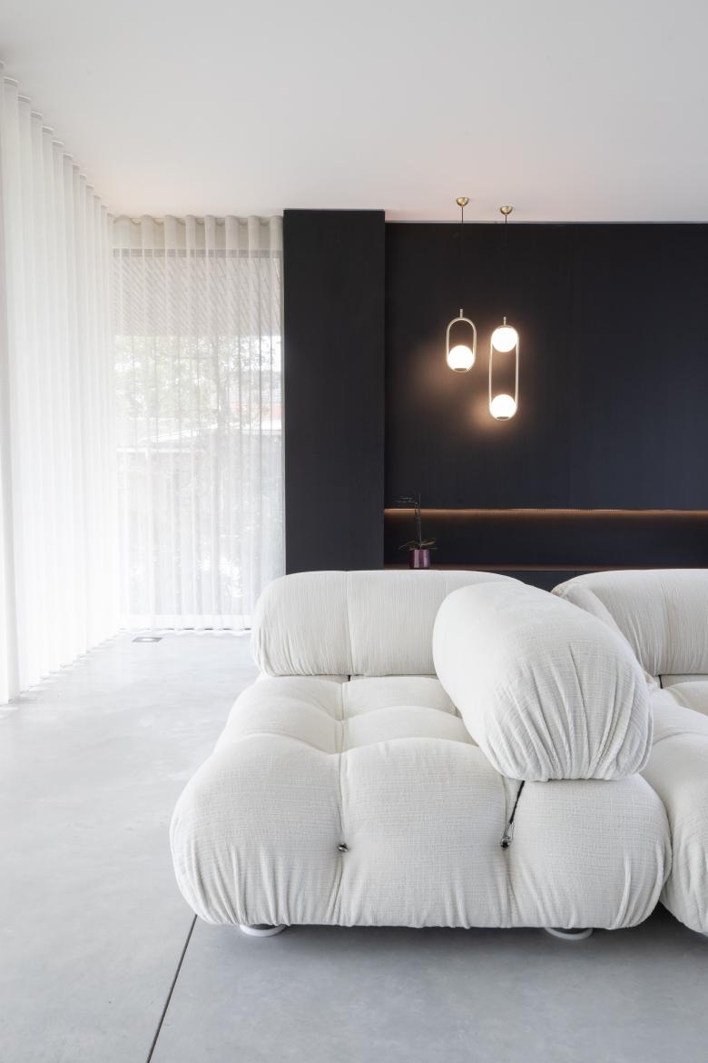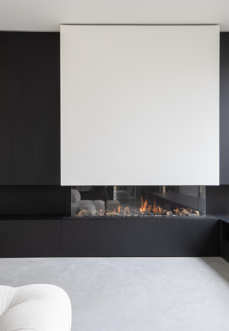 The house offers a serene living experience, even though it is located along a busy main road. A patio and a recessed entrance hall provide an acoustic buffer. A separate volume divides the living area from the kitchen. The sofa is positioned to allow views in two directions: toward the fireplace or the built-in cabinet wall with a concealed TV. Large façade openings maximize the connection with the garden.