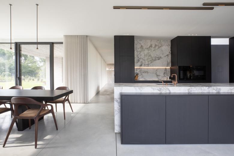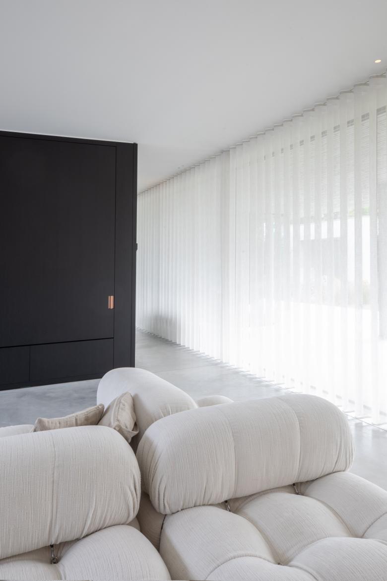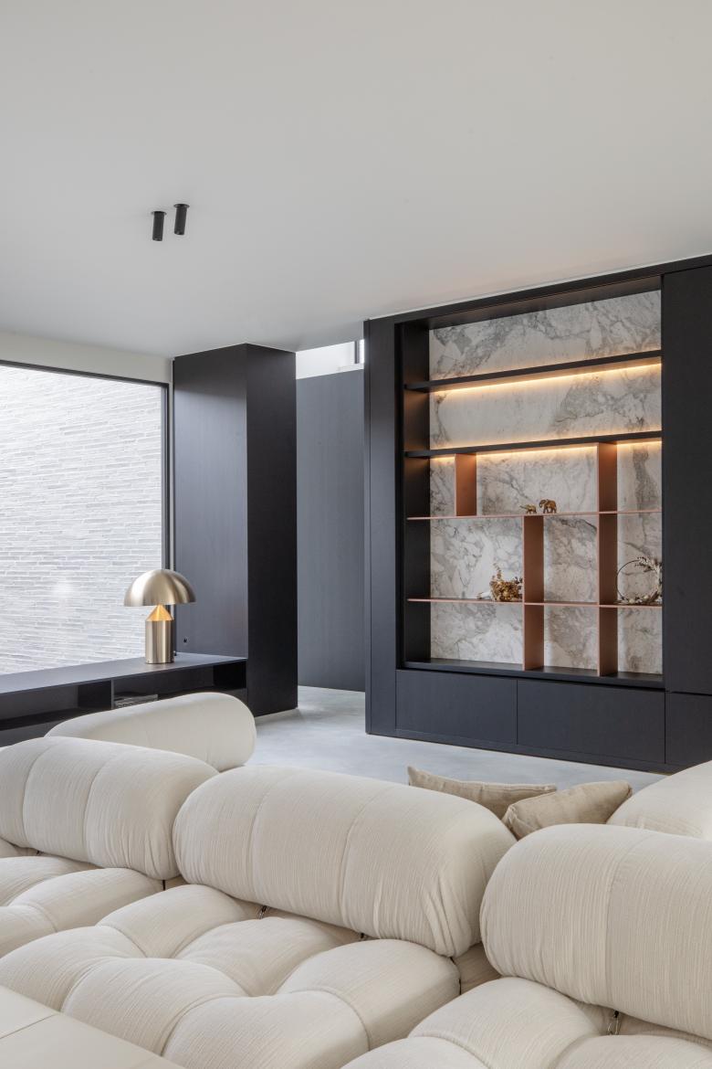 De materialen komen consequent doorheen de woning terug, kijk bijvoorbeeld naar de kastenwand in de zitruimte die overloopt in een verbreed venstertablet aan de patio. Bijzonder aan het maatmeubilair is dat het niet massief is, maar zich als lichte, elementen manifesteert.
