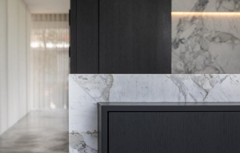 Materials are used consistently throughout the house—for example, the cabinet wall in the living area extends seamlessly into a widened window sill at the patio. A distinctive feature of the custom furniture is its lightness: rather than appearing solid, the elements float delicately within the space.