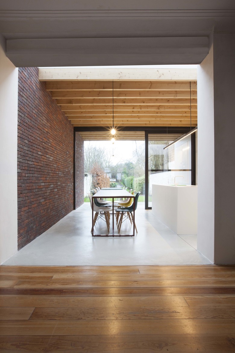 Eerlijk materiaalgebruik en een rijke daglichtinval, dat is de rode draad doorheen de renovatie van deze rijwoning. Een oude achterbouw maakte plaats voor een nieuwbouwvolume waarin keuken en eethoek een plaats kregen. Een overdekt terras vervolledigt het bouwprogramma. Een gevelbreed raam en een lichtstraat op de grens tussen oud en nieuw halen maximaal licht binnen. Een opvallende, witte keukenwand en dito eiland reflecteren het licht en versterken het ruimtegevoel. Dat centrale gegeven in de ruimte wordt omringd door sobere, eerlijke materialen: een gepolierde betonvloer, hout voor de dakstructuur en een gevelsteenwand die doorloopt tot buiten en daar als het ware het terras omkadert.
