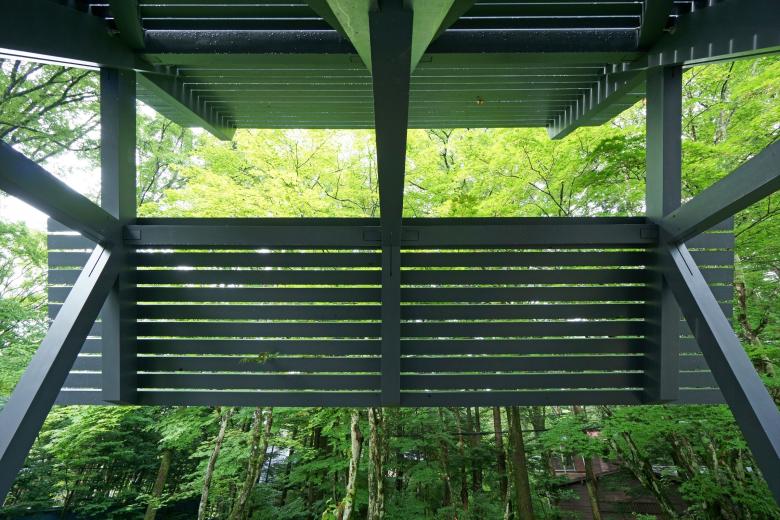 その外構の一部に、休憩スペースとしてのフォリーを増築した。フォリーは屋根や庇や壁を兼ねた角度が異なる6枚のサーフェイスから構成されている。それらの大きさや角度はそこに佇む行為に対してのヒューマンスケールであると共に太陽光の角度や耐風圧からも検討し、更に板のピッチ幅は雨水の流れをシミュレーションした結果を反映した上部から下部へのグラデーションとしている。フロアレベルは2つあり、低い方は斜め壁を背に段差を利用して大きなベンチのように座れ、高い方は足を投げ出して縁側のように開放的に座れる。またこのフォリーは通りからも見える位置に配置することにより、軽井沢という厳しい景観規制のなかで、生まれ変わった施設の「何も書かないビルボード」としての役割も果たす。