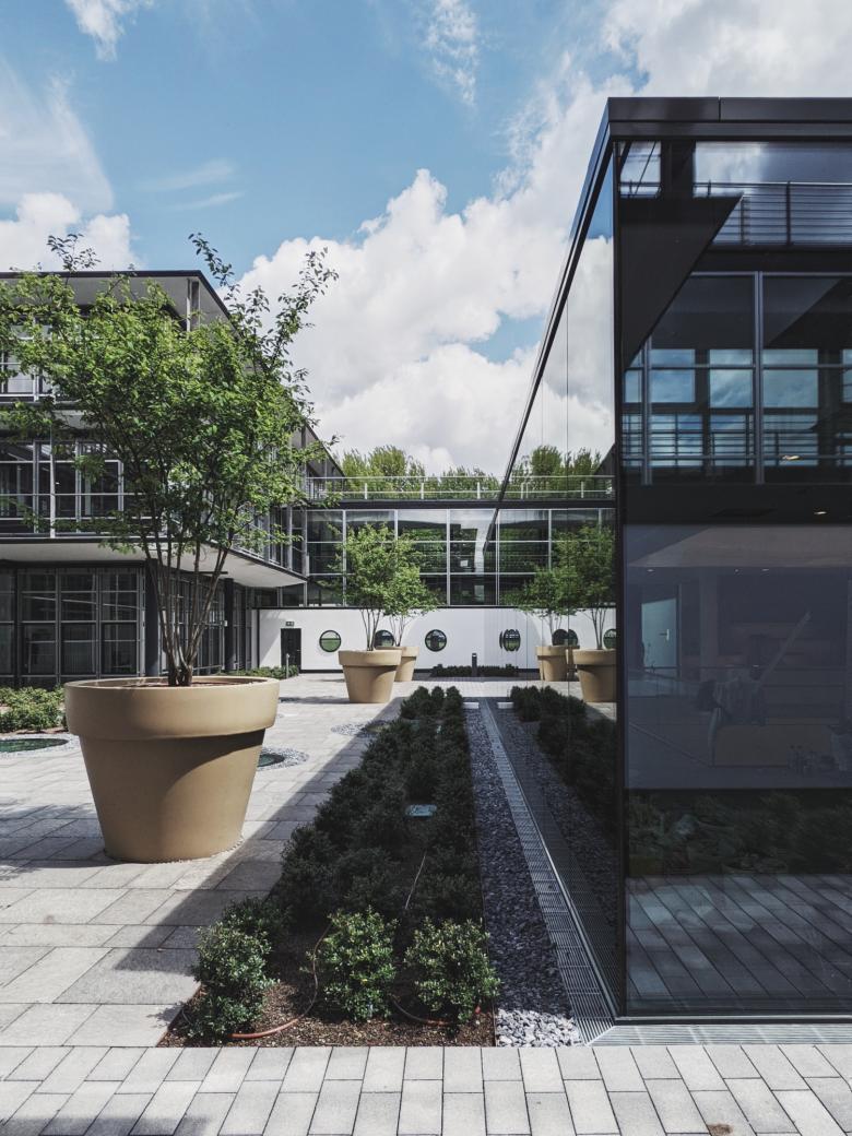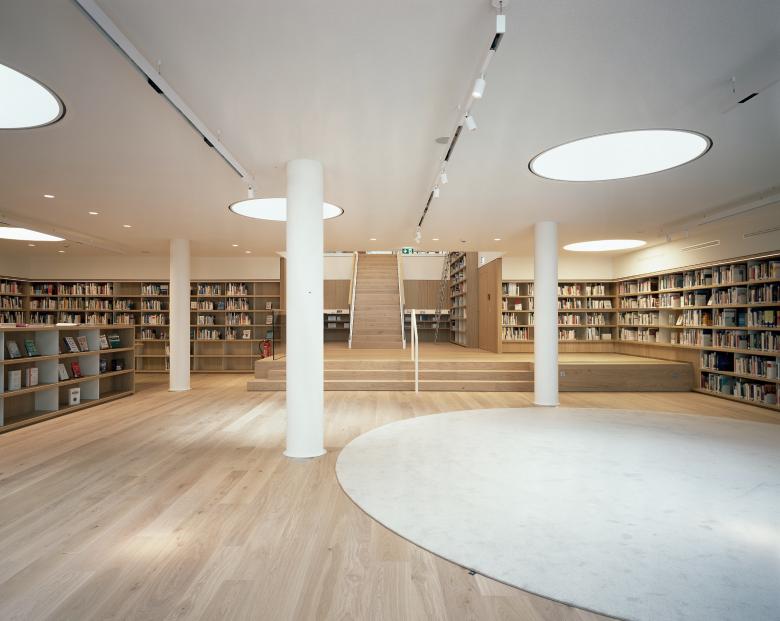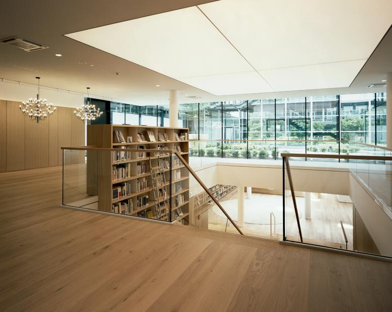 In die bestehenden Pavillonstruktur ist das neue Workcafé als zentraler Kommunikations- und Veranstaltungsraum integriert worden. Die großflächigen Verglasungen ermöglichen Sichtverbindungen zu den Pavillons und eine hohe Tageslichtqualität bis in die im Untergeschoss angeordnete Bibliothek.