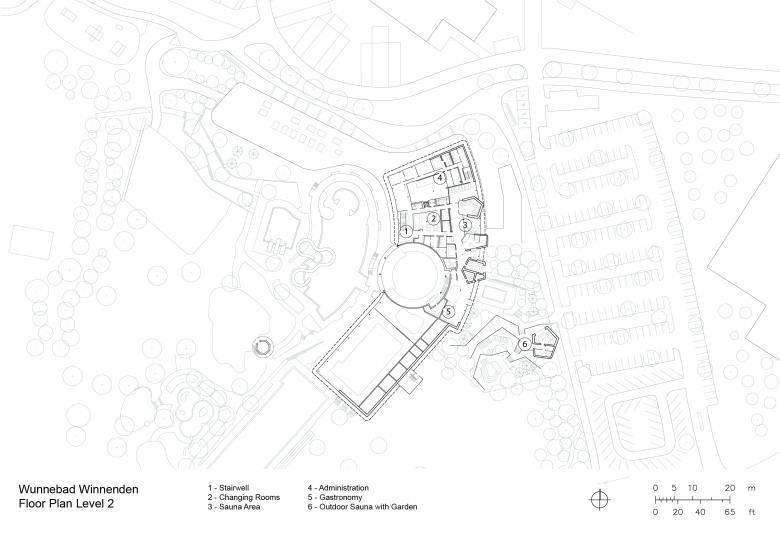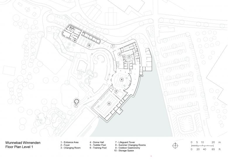The design concept draws inspiration from the unique surroundings, incorporating the topographically shaped open spaces of the outdoor pools and the existing Wunnebad to formulate a central idea that harmoniously connects the old and the new. At the heart of the new facility stands the striking domed structure of the original bathing hall. This is complemented by a composition of curved roofs and organic forms, which ef-fortlessly integrate the various functional areas. The form of the reworked building re-sponds to its context with sensitivity, blending seamlessly into the environment.