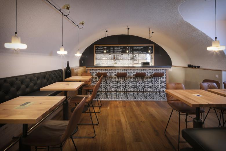 Die historischen Gewölbe im Keller geben den Räumen eine spezielle Atmosphäre welche gut in das Thema Weinbar passt. Auf den insgesamt 122 Quadratmeter befinden sich, neben einem Eingangsbereich und einer Küche, eine Bar mit zwei Aufenthaltsräumen für Gäste. Ein Zementfliesenboden zieht sich durch den kompletten Eingangsbereich um dann mit einem radikalen Wechsel zu Parkett den Wechsel zum Barbereich zu unterstreichen. Die Möblierung wird von dunklen Farben, Leder und Holz dominiert.