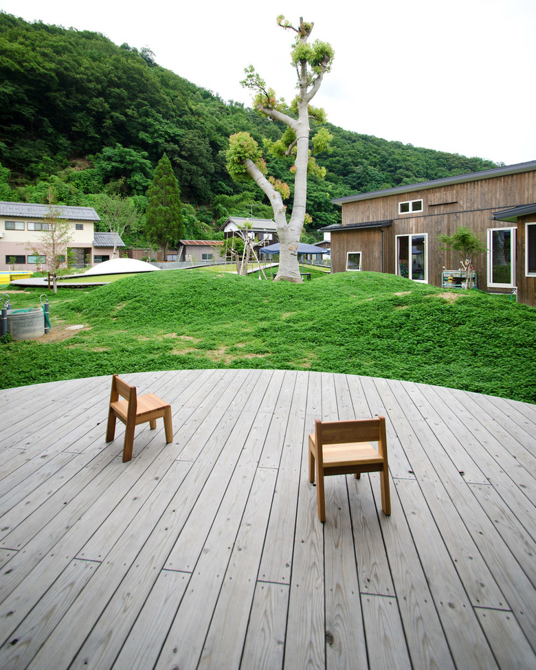 Yamanami nursery school in Obama, Fukui prefecture, is located at the foot of mountains rich in nature. We have created a "circle" of wood decking that goes up and down and around the artificial mounds of the school yard. It performs multiple functions such as a foot path for a stroll, a playground for the children, a spectator's area on sports days, and a stage for photoshoots. The "circle" gently wraps around the children's everyday life.