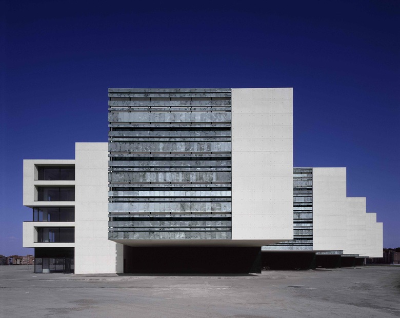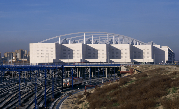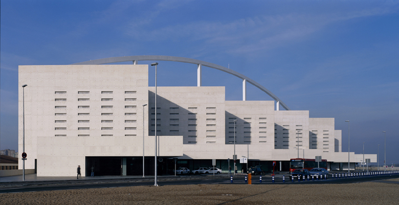 In constructional terms the station itself is made up of large pointed elements of white concrete, thus defining, by means of this constructional system and the possibilities of the jutting bodies and cantilevers of concrete, each of the situations related to the transit, funnelling and protection of the users; entrances, intermediary spaces, concourses and main hall. The roof, resolved with lightweight materials and suspended on nine metal arches that rest on the main concrete volumes, hangs over the interior, and is arranged as a triangular floating composition of light, reflection and constructional geometry. Inside the building, and at night, the illumination of the arches makes is contribution as an element of the dramatic new iconography of 21st-century Zaragoza.