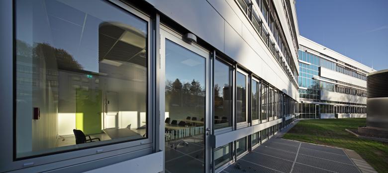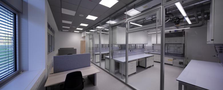 Die Schreibarbeitsplätze der Wissenschaftler, Studenten und technischen Angestellten werden vor den Laborzeilen angeordnet. Durch raumhohe Verglasungen von den Experimentierflächen getrennt, findet ein ständiger visueller Austausch innerhalb der Arbeitsgruppe statt.
