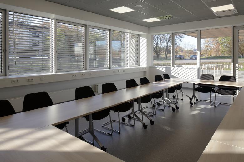 Gemeinschaftlich genutzte Bereiche wie Seminar- und Aufenthaltsräume, Treppenhäuser und Aufzüge werden von der zentralen Eingangshalle erschlossen.