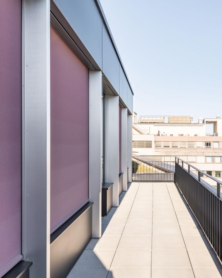 Als Rochadefläche für die Büroflächen der kantonalen Behörden vorgesehen, haben die Räumlichkeiten hohen Ansprüchen bezüglich Flexibilität der Raumaufteilung und des Gebrauchs zu erfüllen. Entsprechend weit ist die geplante Nutzungsvielfalt und eng das damit einhergehende Gebäuderaster, welches diese ermöglicht. Sowohl im Grundriss als auch an der Gliederung der Fassade wird diese zentrale Anforderung an das Gebäude ablesbar. Während die Innenräume um einen Infrastrukturkern angeordnet sind, um unterschiedliche Zonierungen entlang der Fassade zu ermöglichen, bildet diese mit Lisenen aus Aluminium die innenräumliche Gliederung als vertikales Element ab. Analog einem eleganten schwarzen Kleid hüllen sich die Brüstungen in Palissandro Nero. Dieser wird zum einen poliert, flächig eingesetzt, um ein horizontales Gleichgewicht zu den Lisenen zu kreieren, zum anderen wirkt er durch den gefrästen und profilierten Bereich spielerisch, leicht und textil.