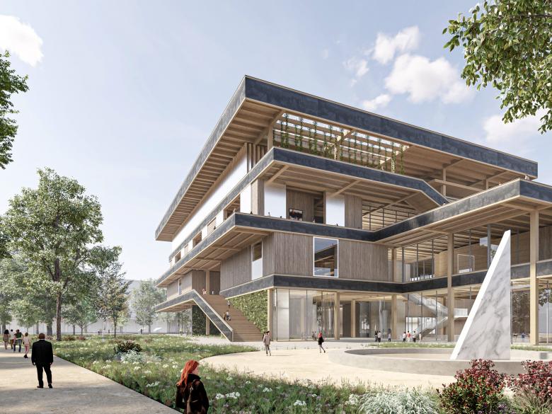 Das Gebäude selbst verzahnt sich auf vielfältige Weise mit dem Außenraum: großzügige Grünflächen, Terrassen und ein durchgehender „grüner“ Erdgeschossbereich mit minimaler Versiegelung verbinden Innen und Außen. Die Struktur des Baus ist robust und flexibel: Ein Raumtragwerk mit doppelter Geschosshöhe erlaubt unterschiedliche Nutzungen – von Ausstellungen über Büros bis hin zu Gastronomie. Dabei wird auf einfache, anpassbare und nachhaltige Bauteile gesetzt, inklusive Re-Use-Materialien und einem Low-Tech-Konzept mit natürlicher Belüftung und Belichtung. Das Zentrum wird auf allen Ebenen durch Terrassen, Dachgärten und öffentlich nutzbare Bereiche ergänzt, wodurch es zu einer „begehbaren Skulptur“ wird, die auch abends belebt bleibt.