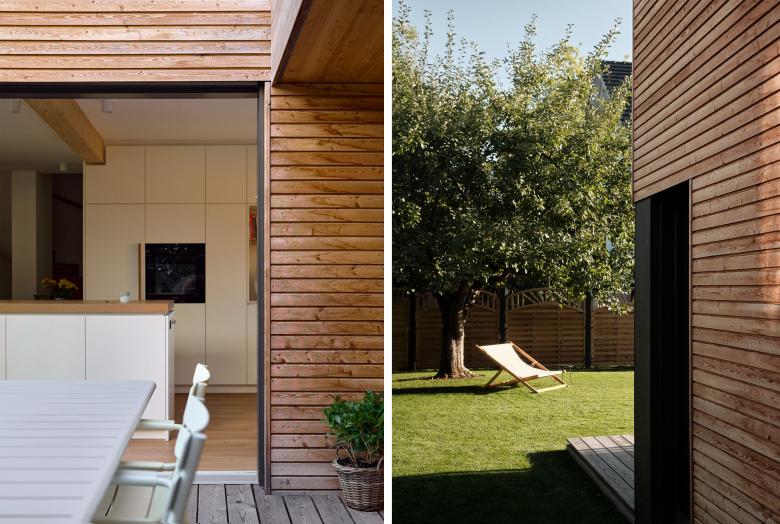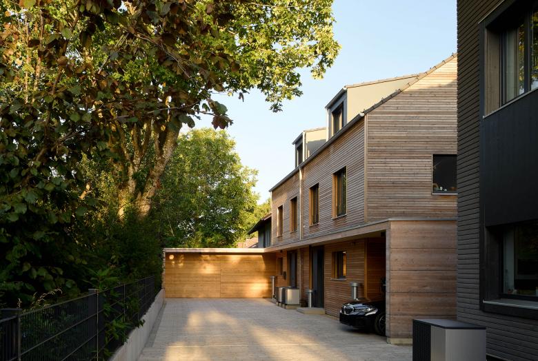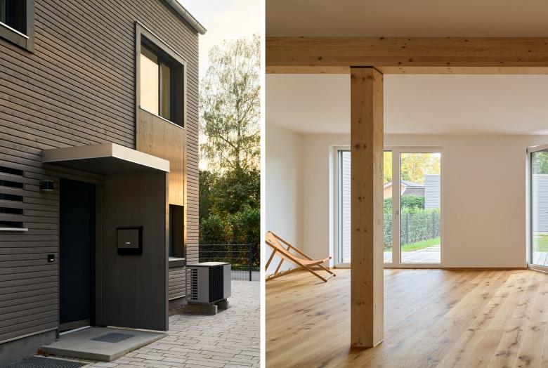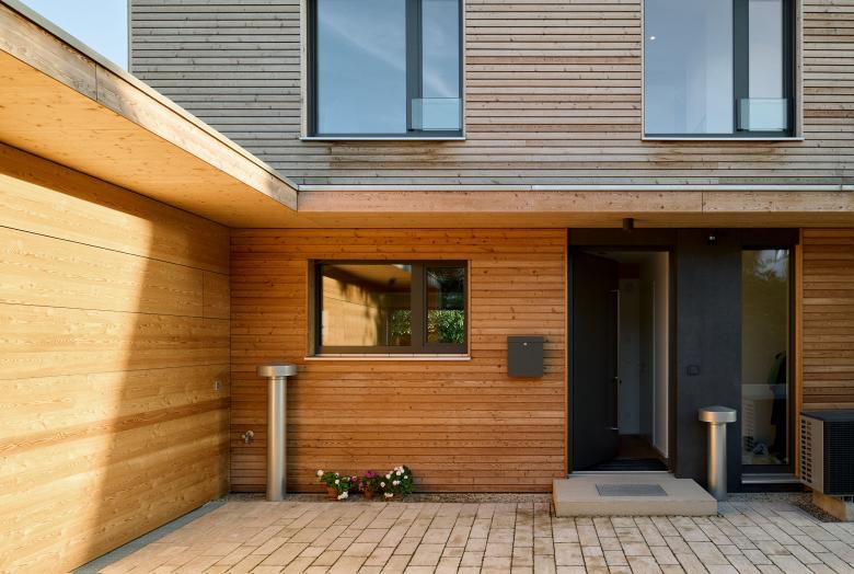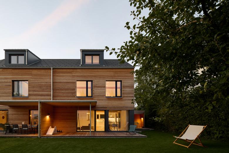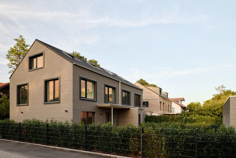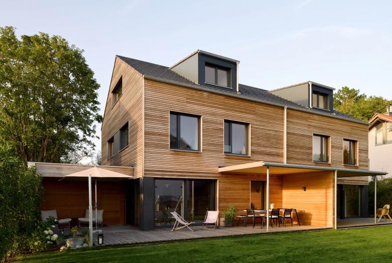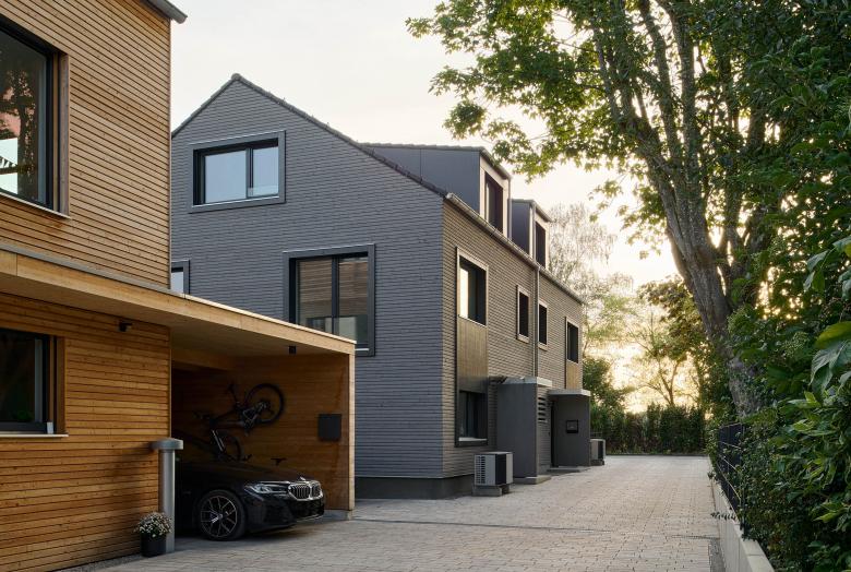 Für das östliche Doppelhaus wünschten sich die Bauherren, die natürliche Haptik der Holzfassade zu bewahren. Somit wird sich diese im Laufe der nächsten Jahre an die graue Fassade des westlichen Hauses anpassen, ehe sie schließlich komplett silbergrau wird.