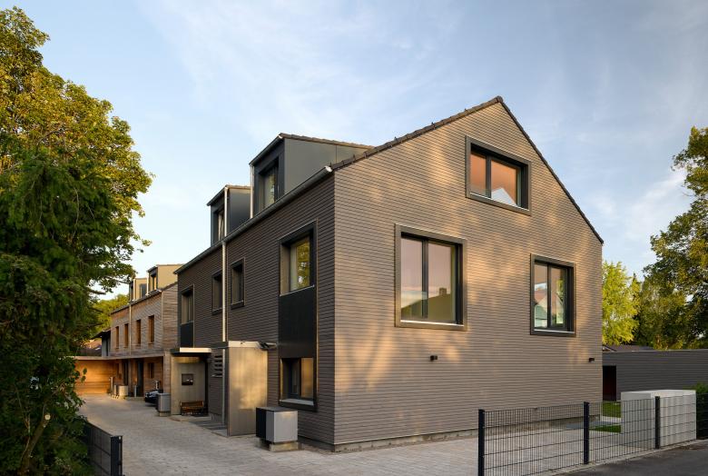 Für das westliche Doppelhaus in dunkler Vorvergrauungslasur wählten wir für die Fenster in den oberen Geschossen eine eigene Einrahmung als Passepartout, da die Fenster mit Blick nach Westen auf die freien Felder konzeptionell von Innen wie ein Bilderrahmen wirken.
