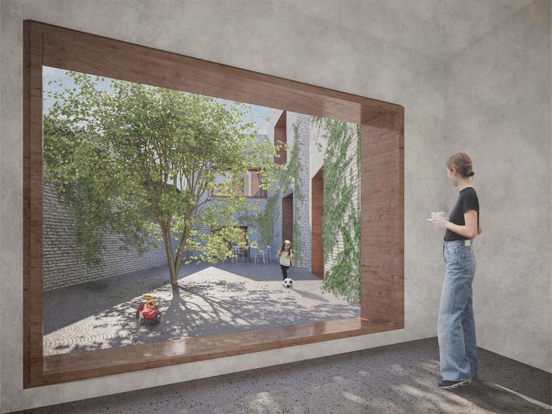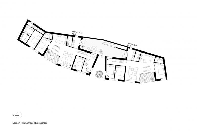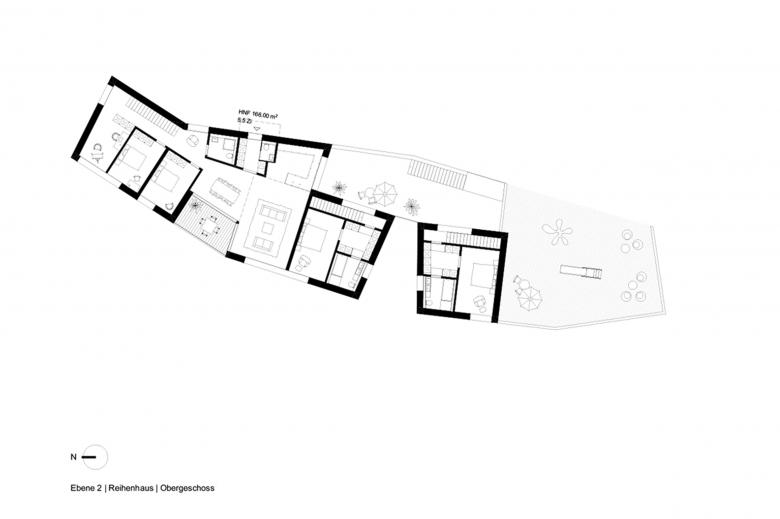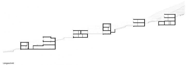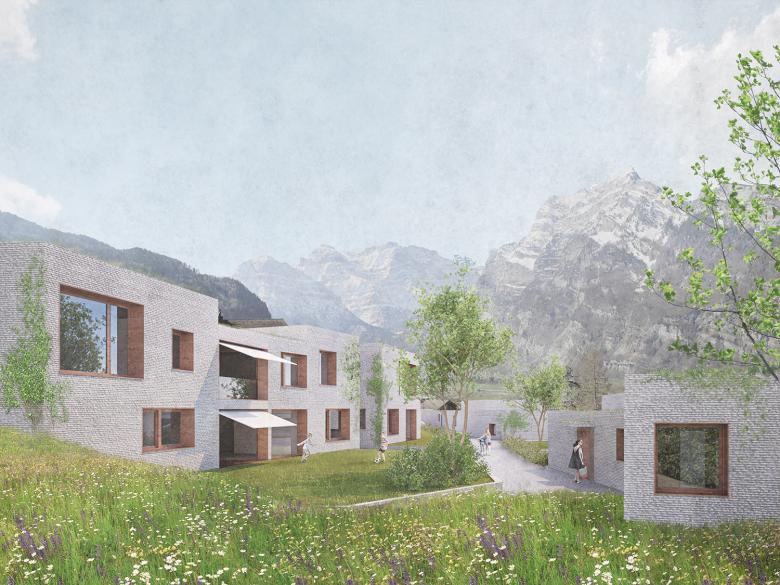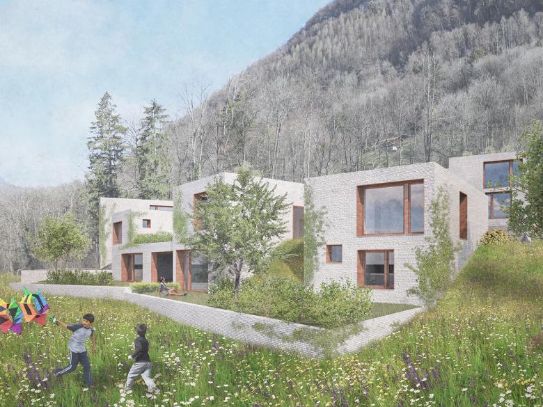 Die Siedlung gliedert sich in 3 Doppelzeilen. Diese werden über die jeweiligen Quartierstrassen separat erschlossen und bestimmen eine mögliche Etappierung. Zwischen den Wohnzeilen befinden sich die Zugänge zu den einzelnen Gebäuden, die entweder direkt vom Zubringerweg oder vom Innenhof betreten werden. Grosszügige Fenster geben den Blick ins Tal frei. Hangseitig versorgen Höfe die Wohnräume mit genügend Tageslicht und laden zum Aufenthalt der Bewohner ein.
