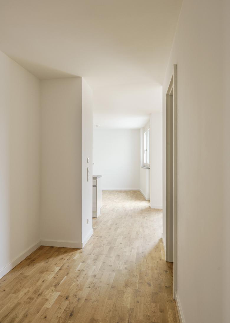 In Verbindung mit den auskragenden Balkonen bildet sich eine Schichtung, welche die rigiden Volumen des vorgegebenen Städtebaus auflöst und den Gebäuden Maßstab und Proportion verschafft. Die Außenlinie der Balkone ist über die einzelnen Geschosse bewusst nicht einheitlich um Abwechslung und Vielfalt zu erzeugen. Die gekantete Kontur der Balkone erinnert an die Zahnräder von Motorgetrieben und an die industriell geprägte Nachbarschaft des Quartiers.