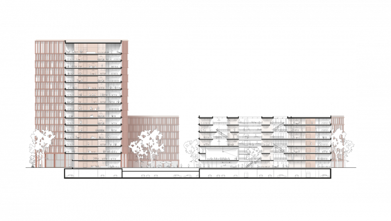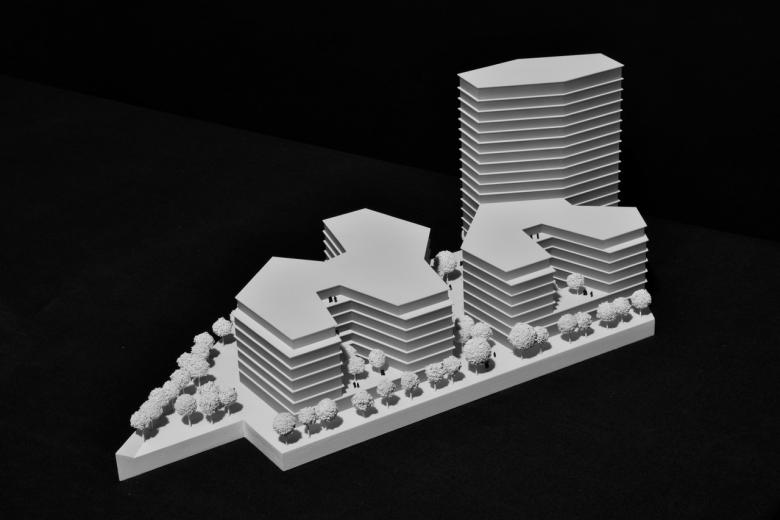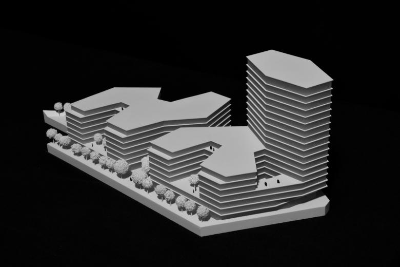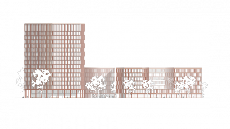 Um eine klare Trennung und einen Quartiersplatz zu schaffen, teilen wir die Baukörper: Ein Gebäude für die Stadtreinigung im nördlichen Teil mit sieben Stockwerken und eines mit angeschlossenem 17-stöckigen Hochhaus mit Gewerbeflächen, Cafeteria und Konferenzräumen im südlichen Teil. Wichtig sind uns dabei der Campusgedanke, ein verbindendes Erdgeschoß und ein Quartiersplatz mit begrünten Aufenthaltsbereichen, der die Menschen ins Viertel lotst – inklusive eines Umweltlehrpfades zur Kreislaufwirtschaft und Recycling.