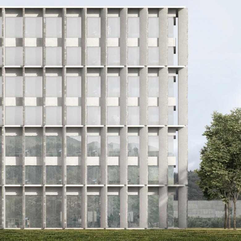Städtebaulich signifikant, am Stadtrand von Kufstein, steht das prägnante Headquarter der Bodner Gruppe von vier Baukörpern flankiert – es dient als Herz des Campus.