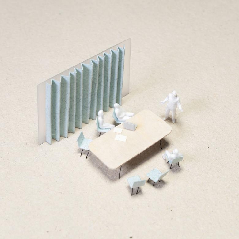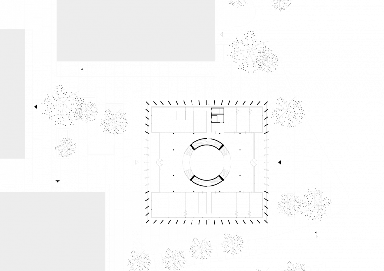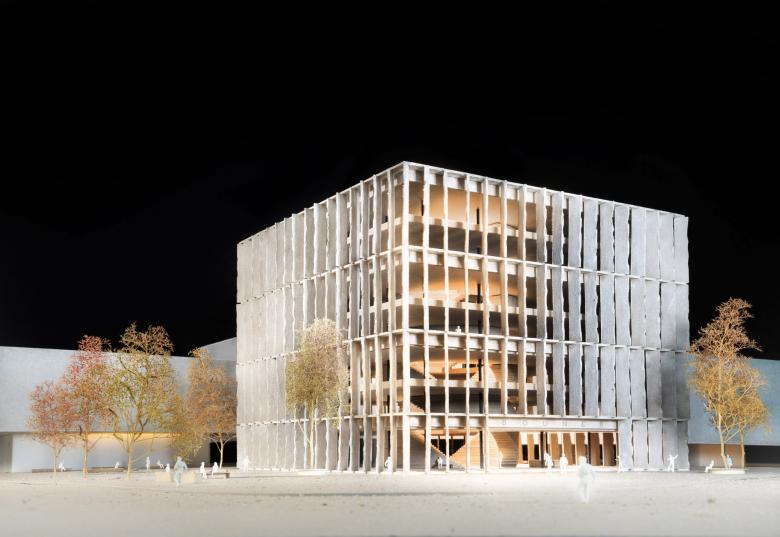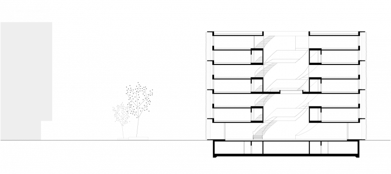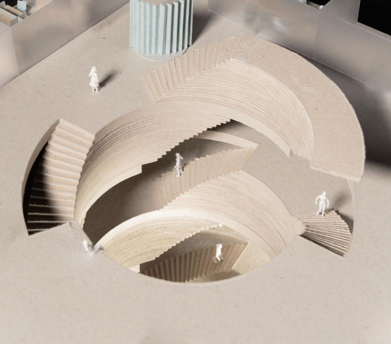 Das Rückgrat des Hauses, das prägnante, kommunikative Treppenhaus ist Weg und gleichzeitig ein lichtdurchfluteter, zentral belichteter Aufenthaltsraum, welcher die Geschosse miteinander verbindet und das ganze Haus symbolisch fasst. Fokus-Boxen für konzentriertes Arbeiten, Desksharing, über kommunikative Meeting- und Besprechungszonen bis informelle Teeküchen: Verschiedenste Raumprogramme können flexibel rund um die Treppen-Doppelhelix angeordnet werden. Diese dient als informeller Meetingbereich mit Sitz-Podesten und ist das verbindende Element zwischen den Geschossen.