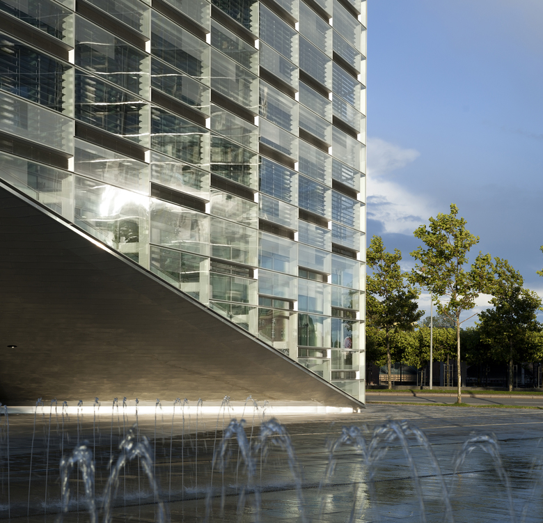 In terms of both form and scale, the building is intermediate between the city and the harbour, and harmonises with neighbouring buildings. The interior layout of the building has been designed for optimum functionality, flexibility and efficiency. The typical floor plan is disposed in a Z-shape around two atria, which ensures that all workstations are well lit and enjoy a view. The disposition of the plan allows the accommodation of open plan, separate offices or meeting rooms. The building is primarily supported by a rhombic construction system placed immediately inside the façade.