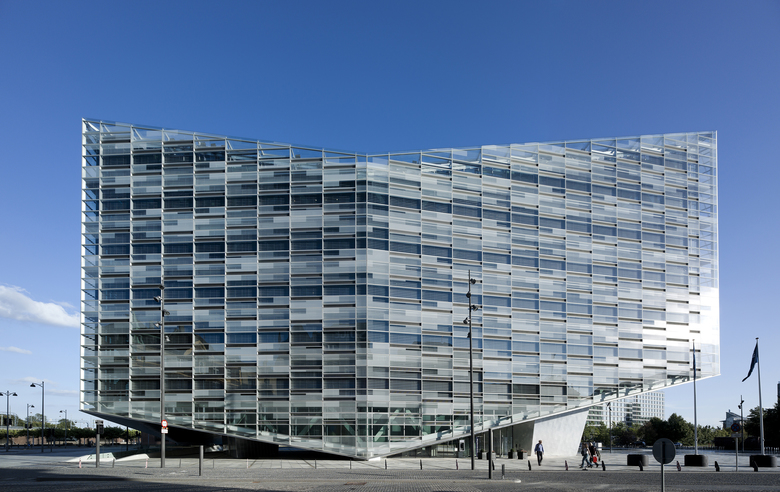 The building’s multi-faceted glass façade reflects both daylight and the immediate surroundings, but the double-glazing also features an integrated sun screen that allows the building to adapt to changing light conditions.