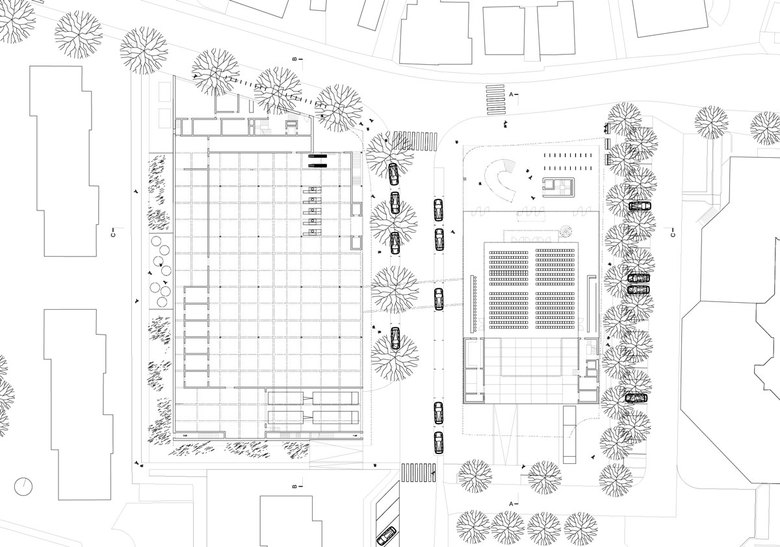 Das gegebene Raumprogramm füllt die beiden zur Verfügung stehenden Parzellen bis fast an deren Rand. Es brauchte daher gezielte Massnahmen, um Raum für die Öffentlichkeit freizuspielen. Während ein bereits existierender Dorfplatz aus den 70er/80er Jahren eher einem introvertierten Hinterhof gleicht, leistet die Setzung der beiden neuen Zentrumsbauten einen Beitrag zur Klärung der Hierarchien im öffentlichen Raum und etabliert die Bahnhofstrasse als erste Adresse von Steinhausen. Analog der schon bestehenden öffentlichen Vorplätze, welche abwechselnd links und rechts entlang der Bahnhofstrasse aufgereiht sind, docken die Bauten mit einem gedeckten Eingangsbereich für Markt und Wohnungen einerseits und einem grossen gedeckten Platz vor Saal und Bibliothek andererseits an diese neu definierte Hauptachse von Steinhausen an.