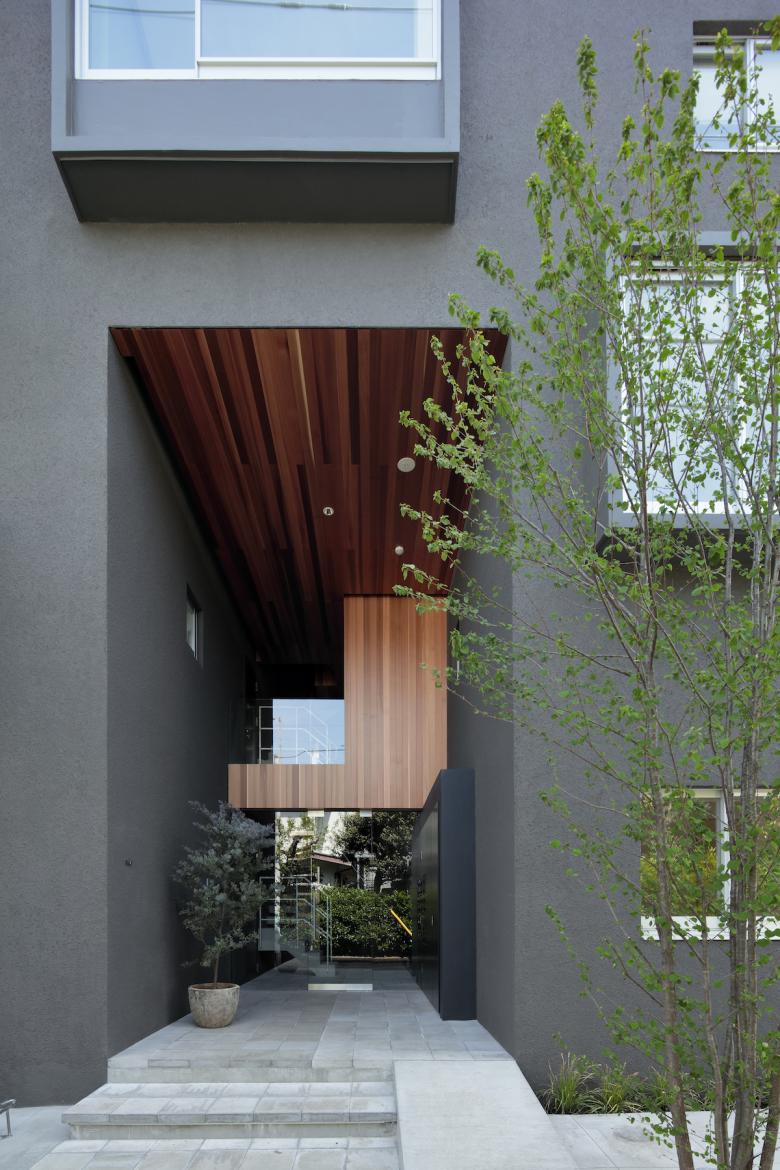 敷地は商店街に隣接した住宅地で、前面道路には戸建て住宅と集合住宅が建ち並ぶ。およそ300平米程の敷地における8戸の住戸からなる集合住宅で、狭くても南側に庭を作ること、出窓を設けること、仕上げに関する事項が条件とされた。