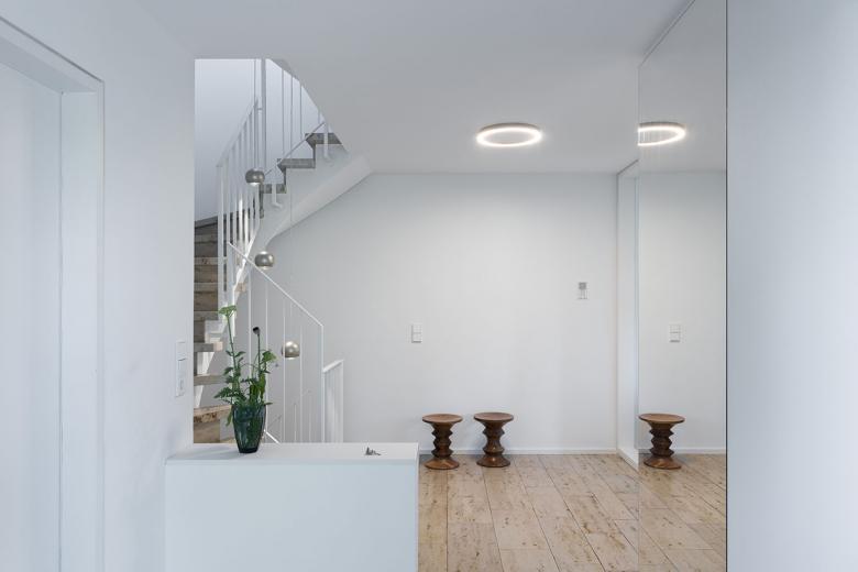 Beim Betreten des Hauses ist nach dem Umbau von der alten Enge nichts mehr zu spüren. Wie viele Doppelhaushälften aus den 1970er-Jahren hatte auch diese einen kleinen Windfang ohne Platz für eine Garderobe, eine schmale Küche und eine enge, dunkle Treppe ins Obergeschoss. Ein geschickt platzierter Einbauschrank, ein großer Spiegel und viel Licht von oben verdoppeln jetzt den Raumeindruck beim Eintreten.