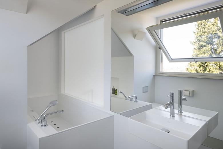 Außen weicht die drückende dunkle Dachverkleidung einem schmalen und hellen Dachrand. Dadurch hat das Haus ein freundlicheres Gesicht. In einer neuen Dachgaube ist jetzt ein zweites Bad, das spielerisch mit den verschiedenen Dachschrägen umgeht; die Badewanne steht quer im geforderten Brandabstand.
