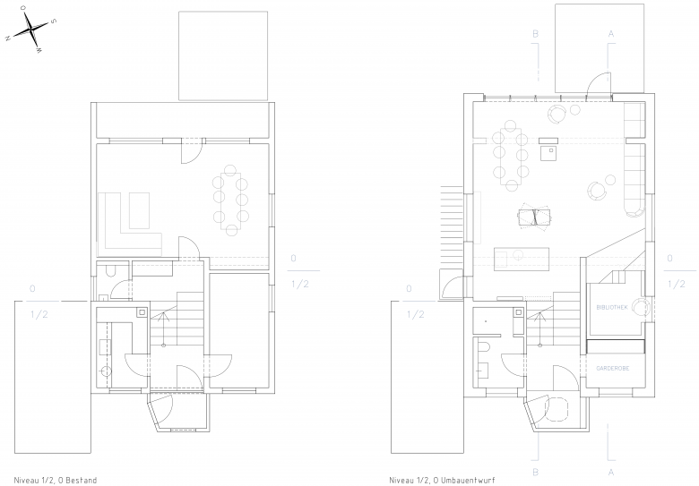 Die Halbgeschosse sind sicht- und bewohnbar, indem zwei versetzte Räume zueinander geöffnet und das Treppenhaus freigelegt und belichtet werden. Die großen freien Räume zum Garten bilden einen Gegensatz zu den gestapelten kleinen Zimmern auf der anderen Hausseite.