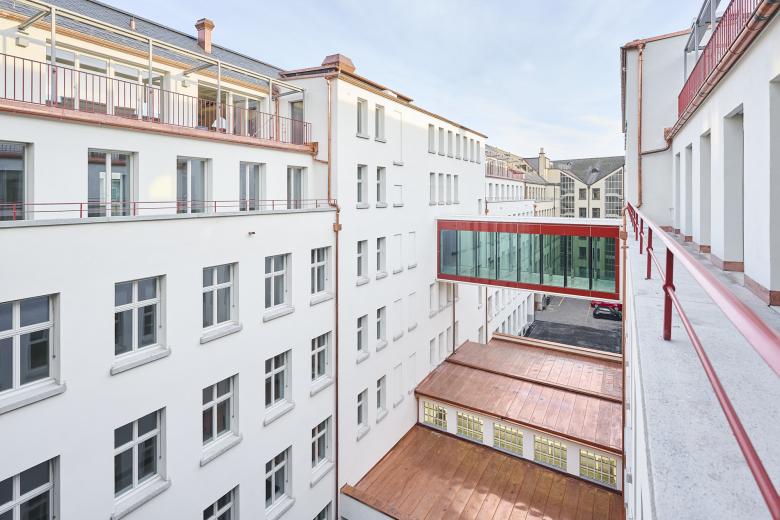Mit dem Einbau einer Passerelle gelang es, die beiden Gebäudeteile auch im 3. Obergeschoss zusammenzubinden. Die zusätzlich gewonnene Flexibilität in der Nutzung erhöht die Vermietbarkeit des Objekts und stellt somit einen klaren Mehrwert für die Liegenschaft dar. Die Fassade zum Hof wurde geöffnet, ergänzend dazu wurden die Lukarnen vergrössert. Zusammen mit der vorgelagerten Terrasse gewinnt diese Mietfläche wesentlich an Qualität. Die Gebäudehülle wurde vollständig saniert und den energetischen Anforderungen des 21. Jahrhunderts angepasst.