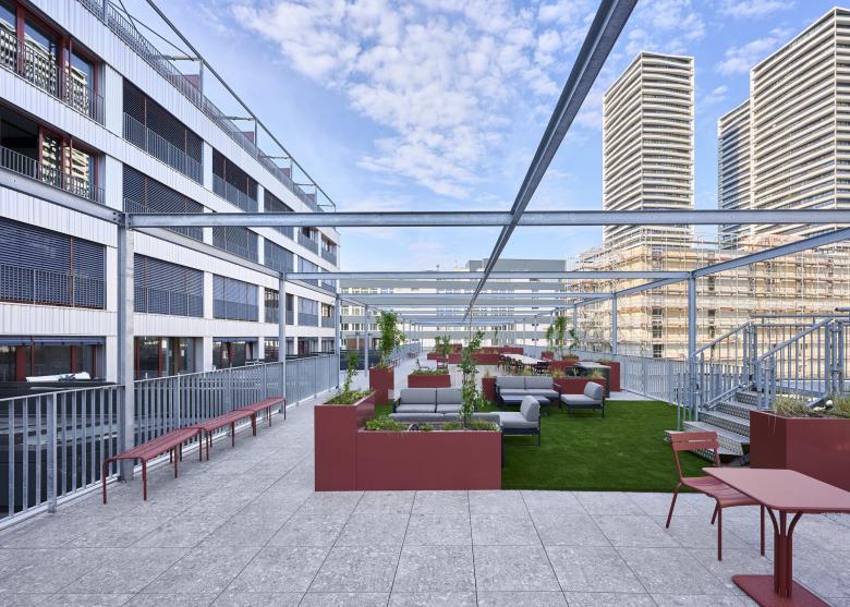 Das bestehende Gebäude direkt an der Tramhaltestelle der Ringstrasse wurde zu einer Wohn- und Dienstleistungsliegenschaft transformiert und erweitert damit das differenzierte Wohnungsangebot der angrenzenden neuen Bebauung. Mit diesem Umbau entstand ein vielfältiges Wohnangebot, mit loftähnlicher Stimmung, grosszügigen Räumhöhen und attraktiven Aussenräumen. Gleichzeitig wurde das Wohnen ergänzt durch ein breites Angebot an Indoor-Sportmöglichkeiten im Hallengeschoss und zusätzlichen Flächen für Co-Working oder Homeoffice in den darüber liegenden Geschossen. Die grosszügige Dachterrasse über der Sporthalle steht allen Mietern zur Verfügung und bietet eine hohe Aufenthaltsqualität nebst dem angrenzenden öffentlichen Büelwisenpark.