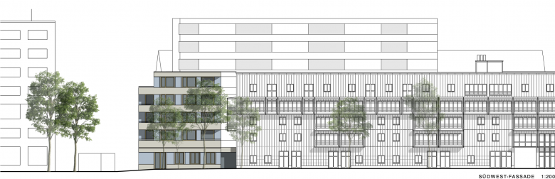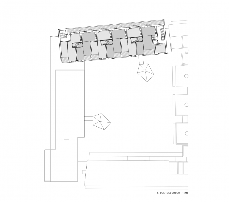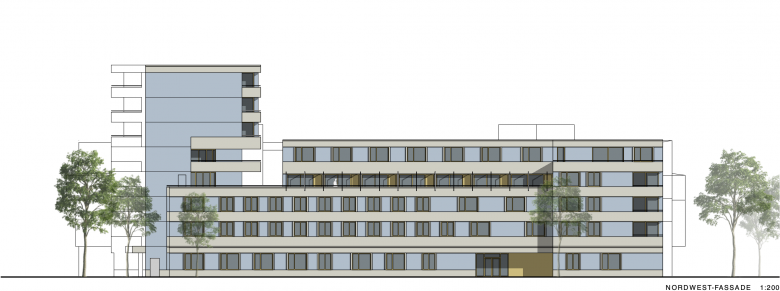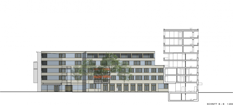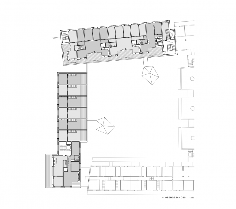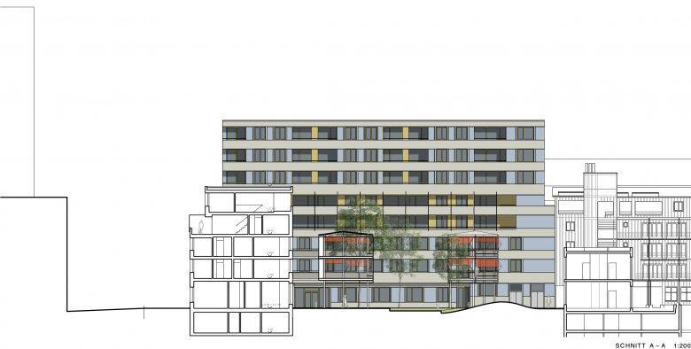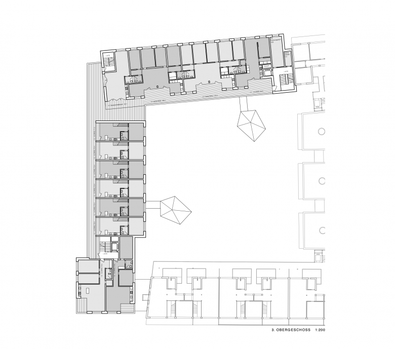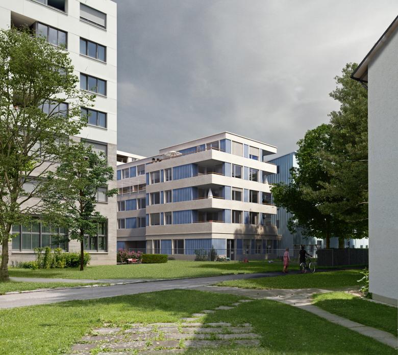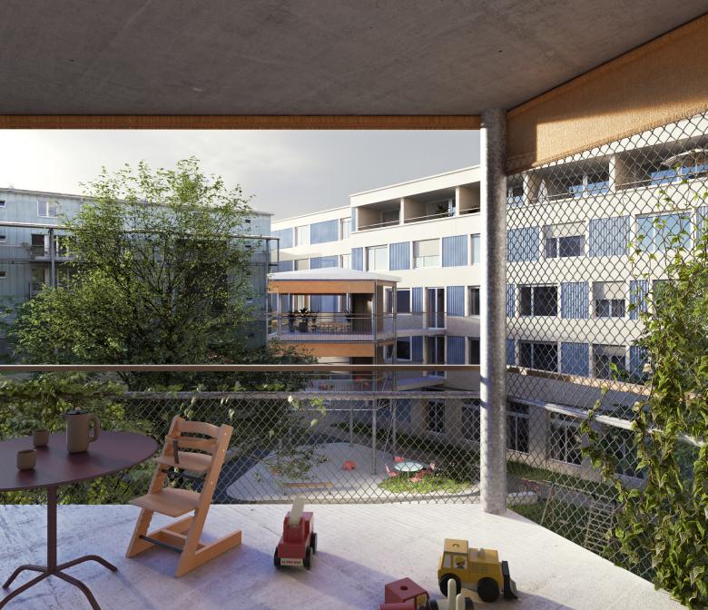 Über dem Kinderheim, ab dem 3. Obergeschoss, löst sich der L-förmige Gebäudekörper auf in zwei unabhängige Volumen unterschiedlicher Höhe. Hier treffen der äussere Laubengang des Westflügels und die zum Innenhof orientierte Verandaschicht der Grosswohnungen aufeinander. Eine Terrasse mit angegliedertem Gemeinschaftsraum wird zum gemeinschaftlichen Zentrum der Wohnsiedlung.