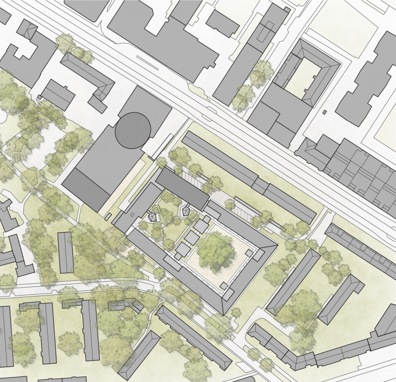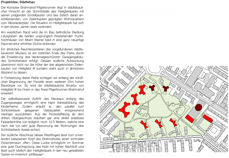 Die Wettbewerbsaufgabe umfasste einen Ersatzneubau für das Kinderheim, ergänzt um ein zusätzliches Wohnangebot zum Brahmshof. Die Anzahl der neuen Wohnung war nicht fest bestimmt, es ging der Veranstalterin auch darum, diesbezüglich die ‚städtebauliche Verträglichkeit‘ auszuloten.