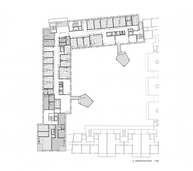 Die Wohnungen sind über zwei periphere, vom Heimbetrieb abgekoppelte Treppenhäuser erschlossen. Diese sind so angeordnet, dass sie im Brandfall auch als Fluchtweg für das Kinderheim dienen können.