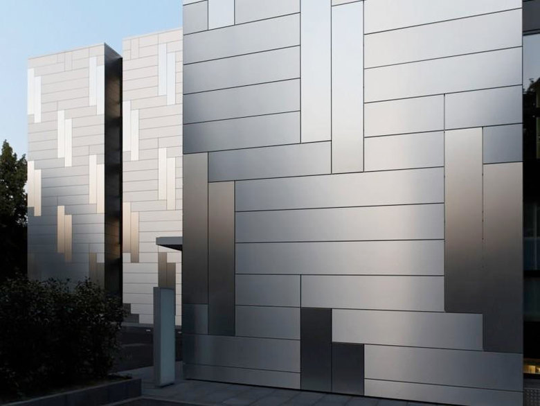 Das Bestandsgebäude wurde komplett entkernt und die sanierungsbedürftigen Fassaden in Gänze abgetragen und neu gestaltet. In der neuen Außenhaut schaffen vertikal und horizontal angeordnete großformatige Tafeln eine homogene Vernetzung der Fassadenfläche. Diese Homogenität wird von den fassadenbündigen Fensterelementen unterstrichen. Der alternierende Rhythmus der gebürsteten Aluminiumtafeln verleiht der sonst ruhigen Fassadengeometrie ein spannungsreiches, mit den Tageszeiten immer wieder changierendes Bild.
